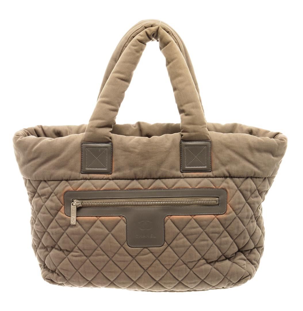 One Chanel Beige Quilted Coco Cocoon Tote Bag. Item is sold AS-IS. All available information is listed in the description and shown in the photo. Chanel beige quilted Coco Cocoon tote bag with nylon exterior, red nylon lining, nude leather squares on the base of the straps and around zippers, one exterior zip pocket, one interior zip pocket, silver-tone hardware, zipper closure, and top handles. There is some fading on the exterior of the canvas as shown in pictures. Height: 9.85" Width: 17.72" Depth: 7.09", Handle Drop: / 25 x 45 x 18 Cm