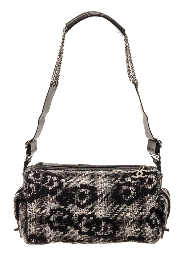 One Chanel Black 2.55 Tweed Chain Shoulder Bag. Item is sold AS-IS. All available information is listed in the description and shown in the photo. Chanel black 2.55 tweed chain shoulder bag with flower patterned black, grey, and white tweed exterior; black Chanel patterned fabric lining, adjustable strap with thin silver-toned chains and black leather shoulder pad; silver-tone hardware, zipper closure, interlocking CC logo as zipper tab, and one interior zip pocket. Height: 6 in (15.24 cm), Width: 7 in (17.78 cm), Length: 12.5 in (31.75 cm)