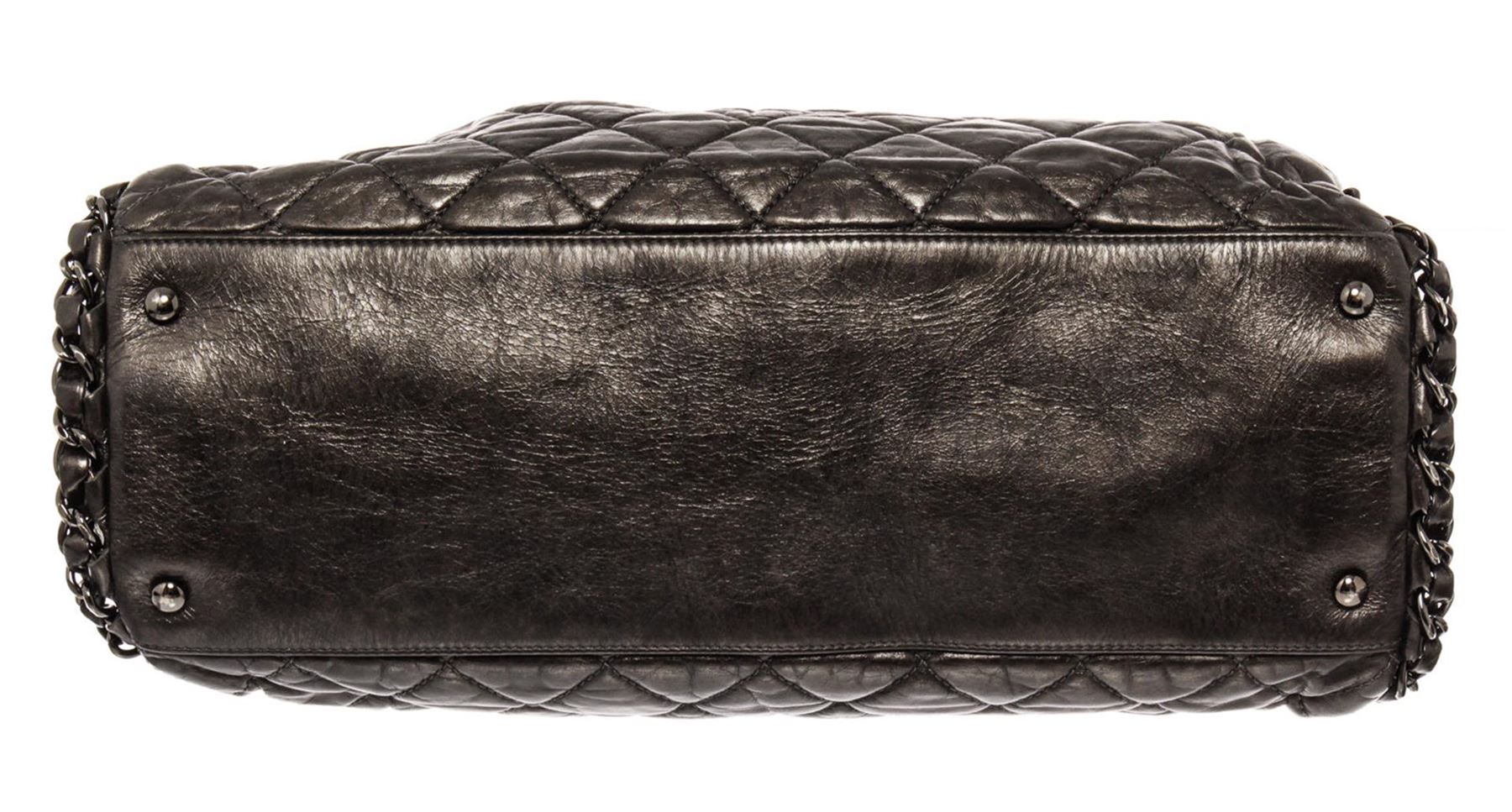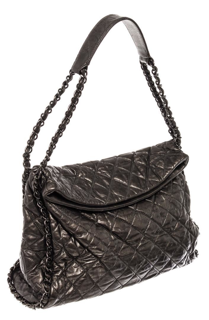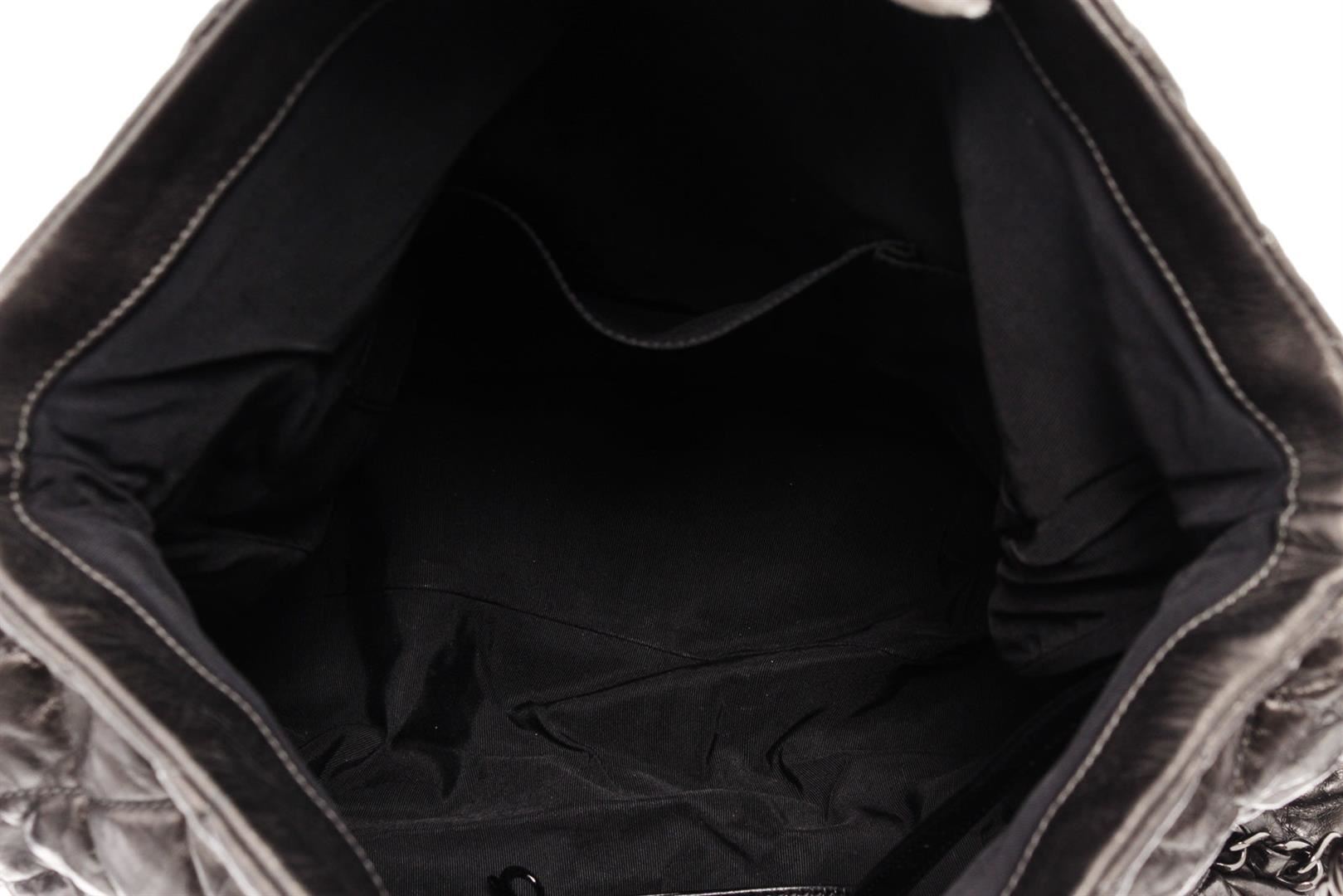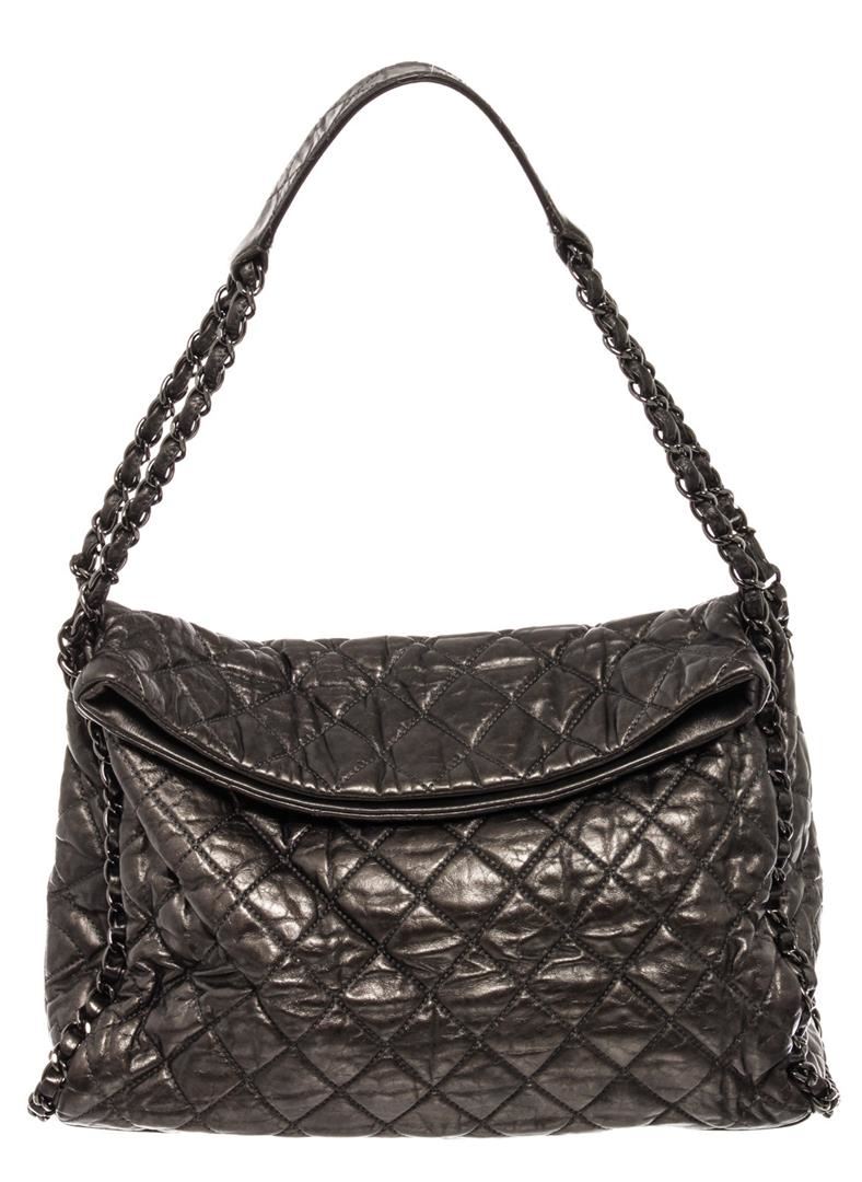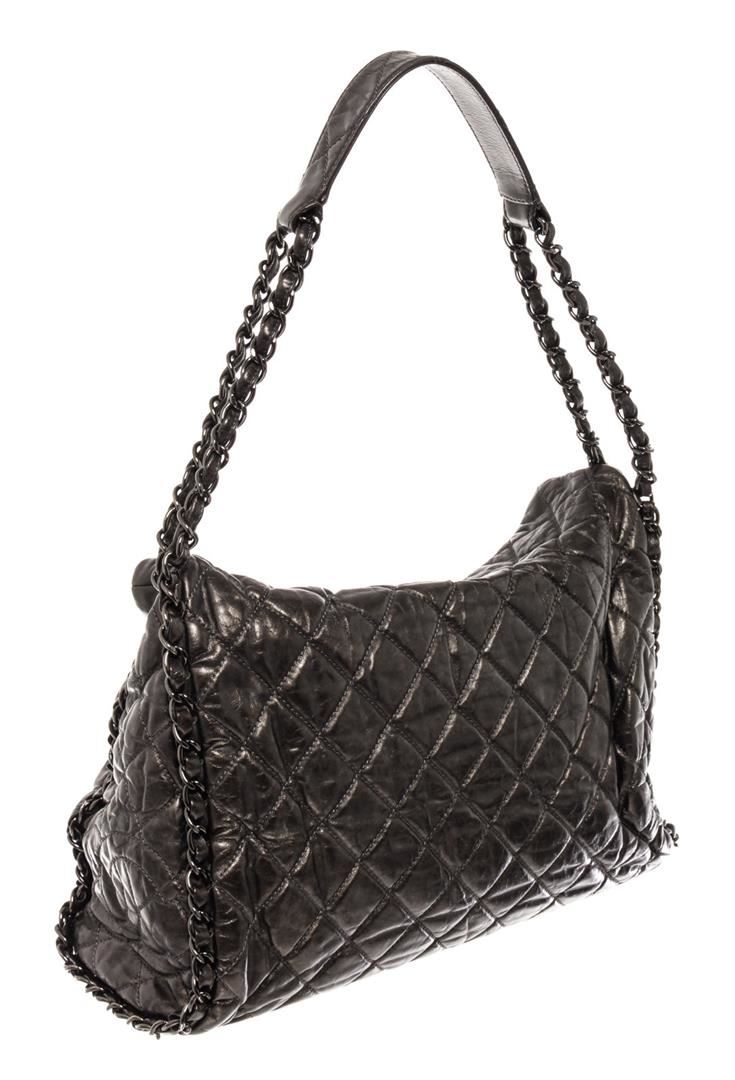 Chanel Medium Hobo Bag is crafted from black quilted Calfskin leather, features woven-in leather chain trims and straps with shoulder pad, and dari silver-tone hardware. Its magnetic snap closure opens to a black fabric interior with zip and slip pockets.