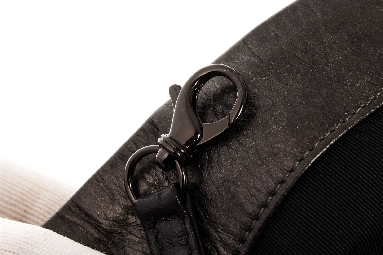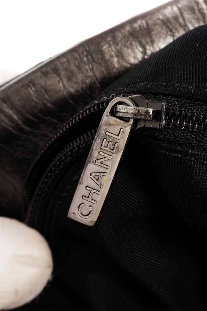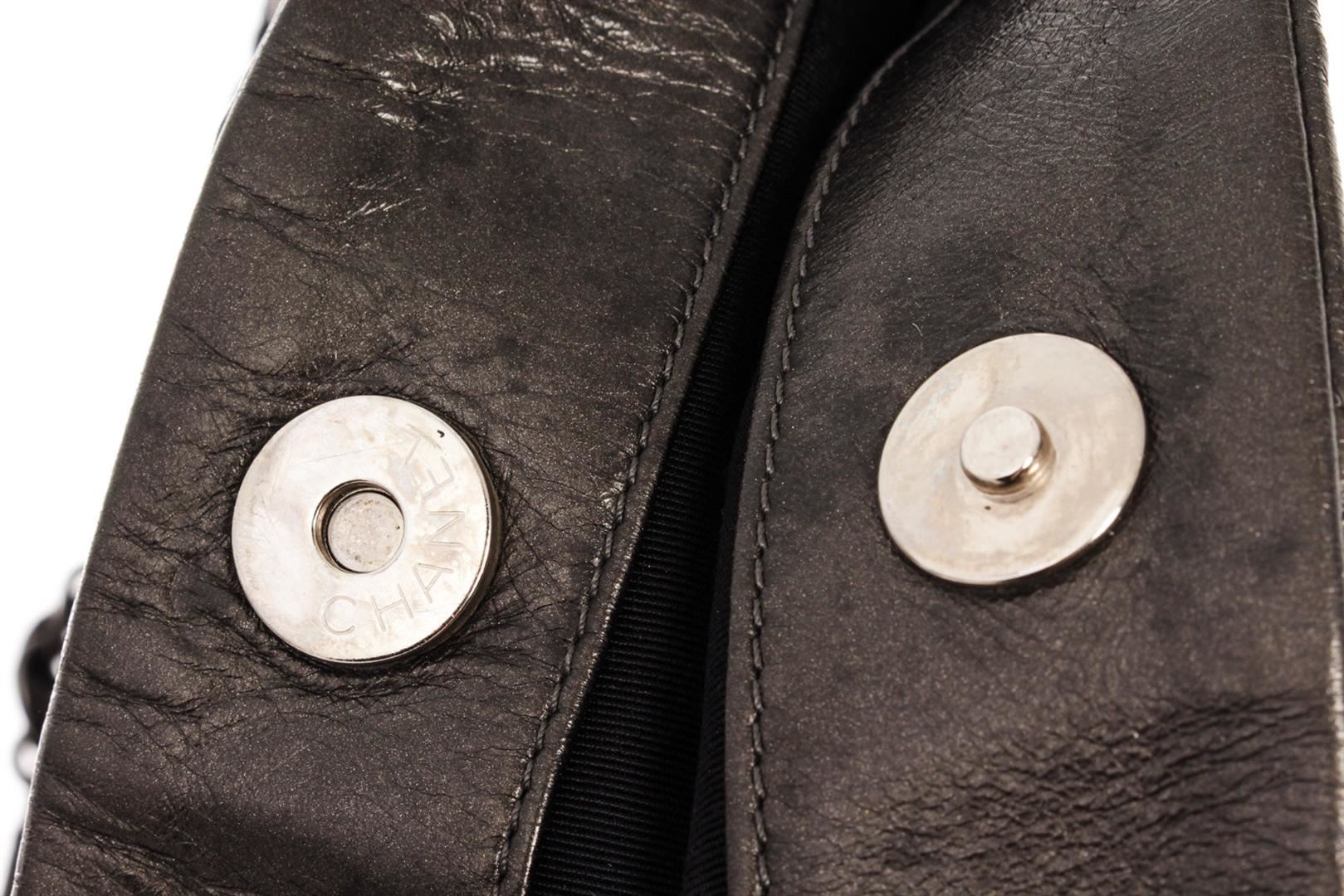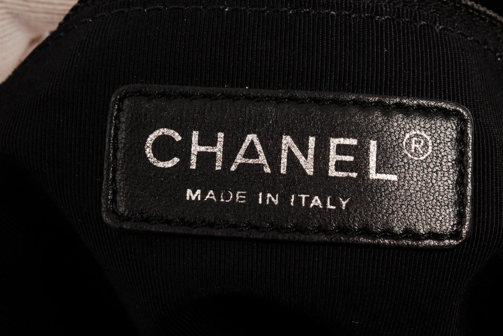 Chanel Medium Hobo Bag is crafted from black quilted Calfskin leather, features woven-in leather chain trims and straps with shoulder pad, and dari silver-tone hardware. Its magnetic snap closure opens to a black fabric interior with zip and slip pockets.