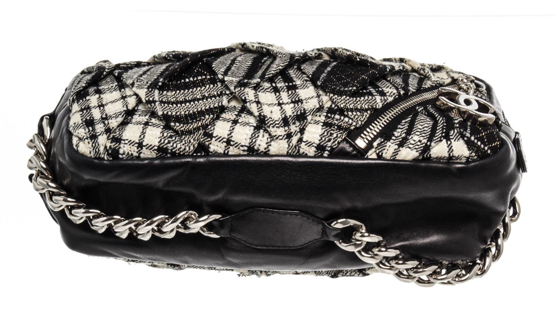 One Chanel Black Canvas Leather Twisted Tweed Shoulder Bag. Item is sold AS-IS. All available information is listed in the description and shown in the photo. Chanel Black Canvas Leather Twisted Tweed Shoulder Bag with canvas leather, silver-tone hardware, interior slip pocket, chain shoulder strap and flap closure.