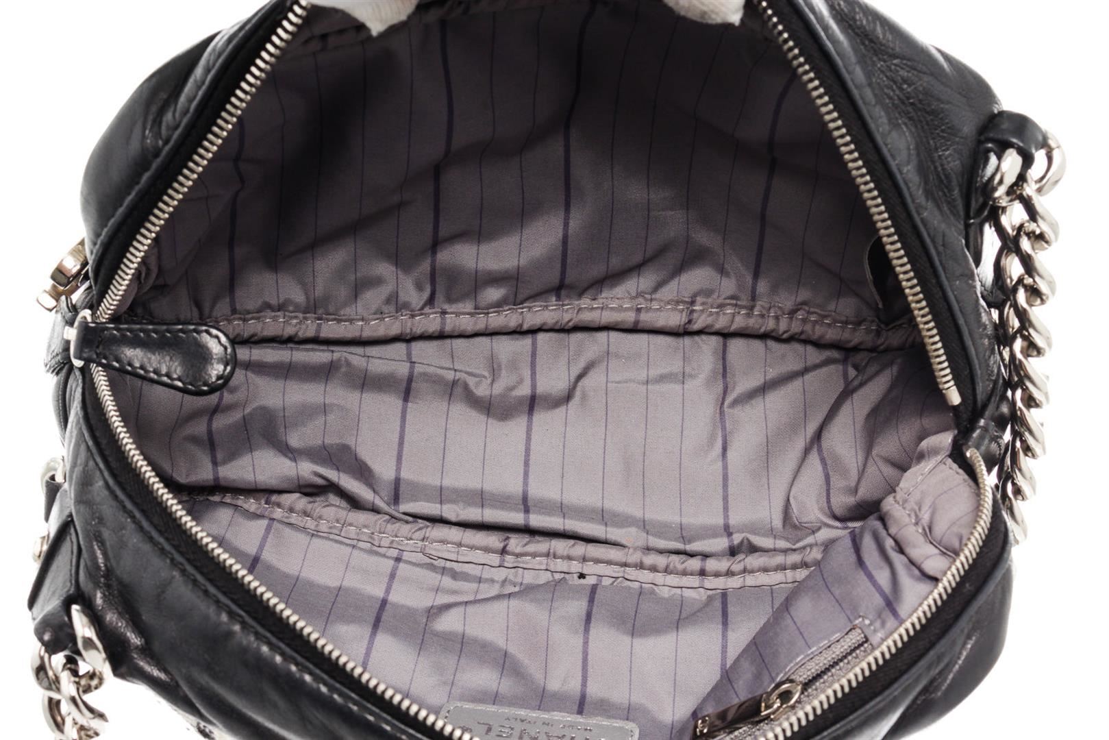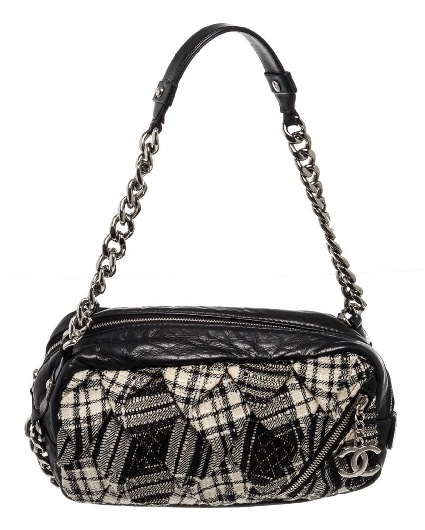 One Chanel Black Canvas Leather Twisted Tweed Shoulder Bag. Item is sold AS-IS. All available information is listed in the description and shown in the photo. Chanel Black Canvas Leather Twisted Tweed Shoulder Bag with canvas leather, silver-tone hardware, interior slip pocket, chain shoulder strap and flap closure.