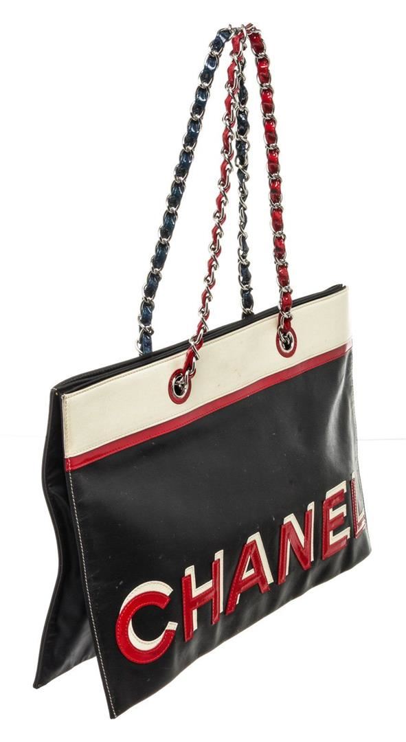 Chanel Black Canvas No. 5 Star Chain Shoulder Bag with canvas, silver square Quilted leather, woven in red leather chain link straps, white-stitched chanel CC and red number 5 details, silver tone hardware and silver vinyl foil lined interior.