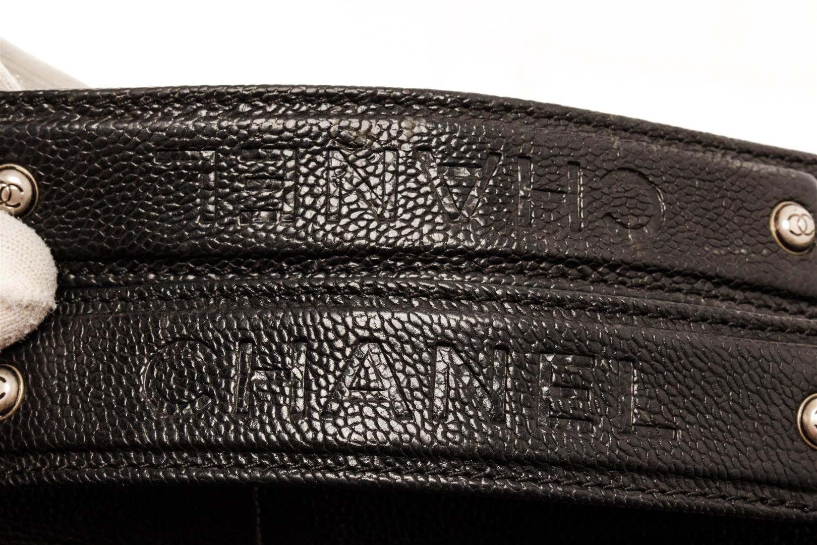 Chanel Black Caviar Leather CC Chain Tote Bag. All available information is listed in the description and shown in the photos. Chanel Black Caviar Leather CC Chain Tote Bag with gold-tone harware, caviar leather body, chain straps with leather guard, open top with hook closure, and interior zip pocket.