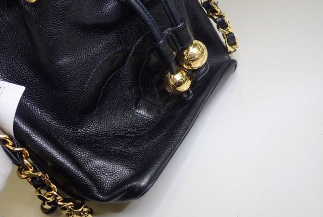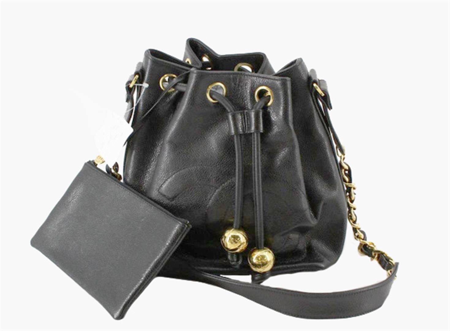 Black Caviar leather Chanel CC Stitch Logo Drawstring bucket bag with gold-tone hardware, single flat shoulder strap with woven leather and chain-link accent, interlocking CC logo stitched at front, drawstring closure at top, black leather lining and smal