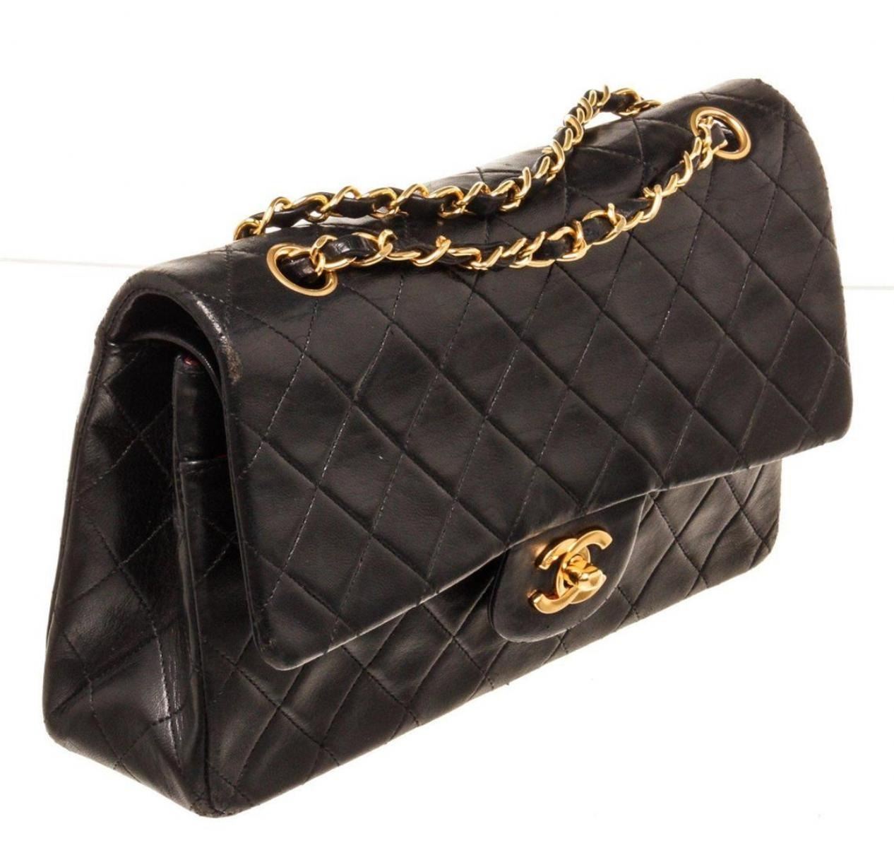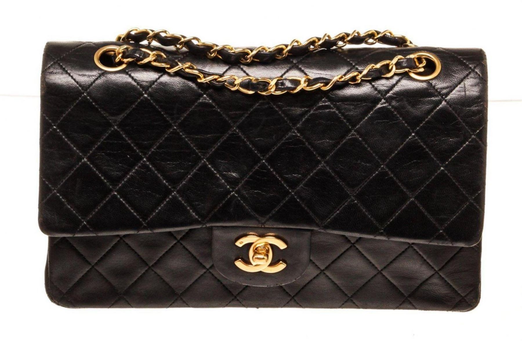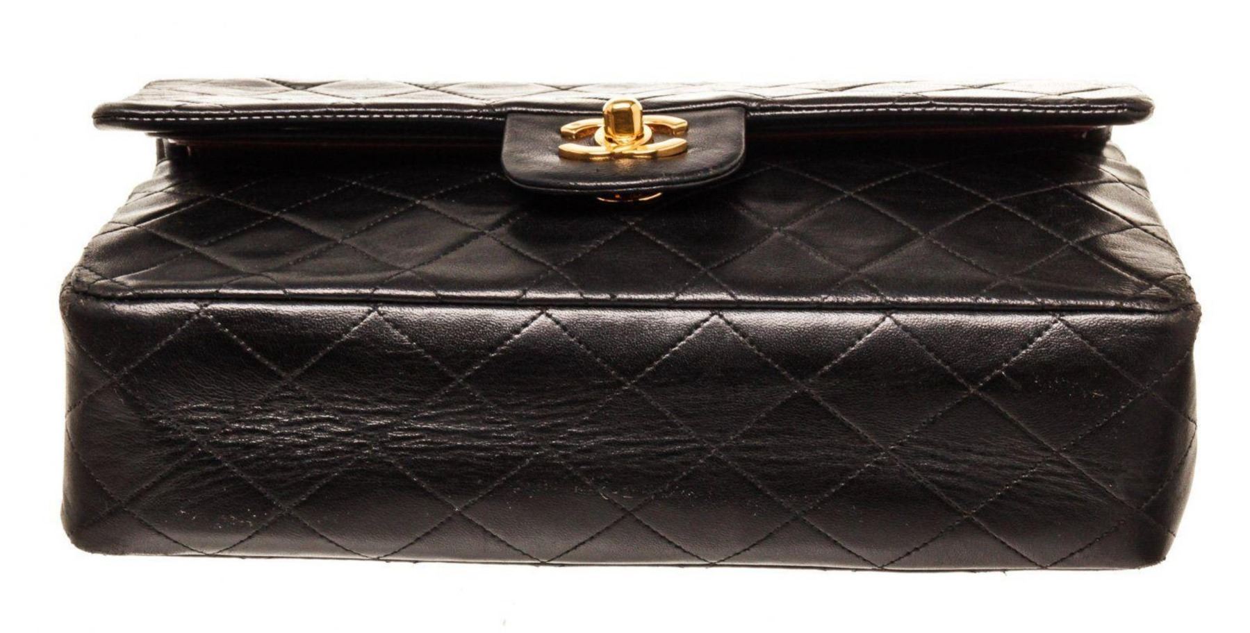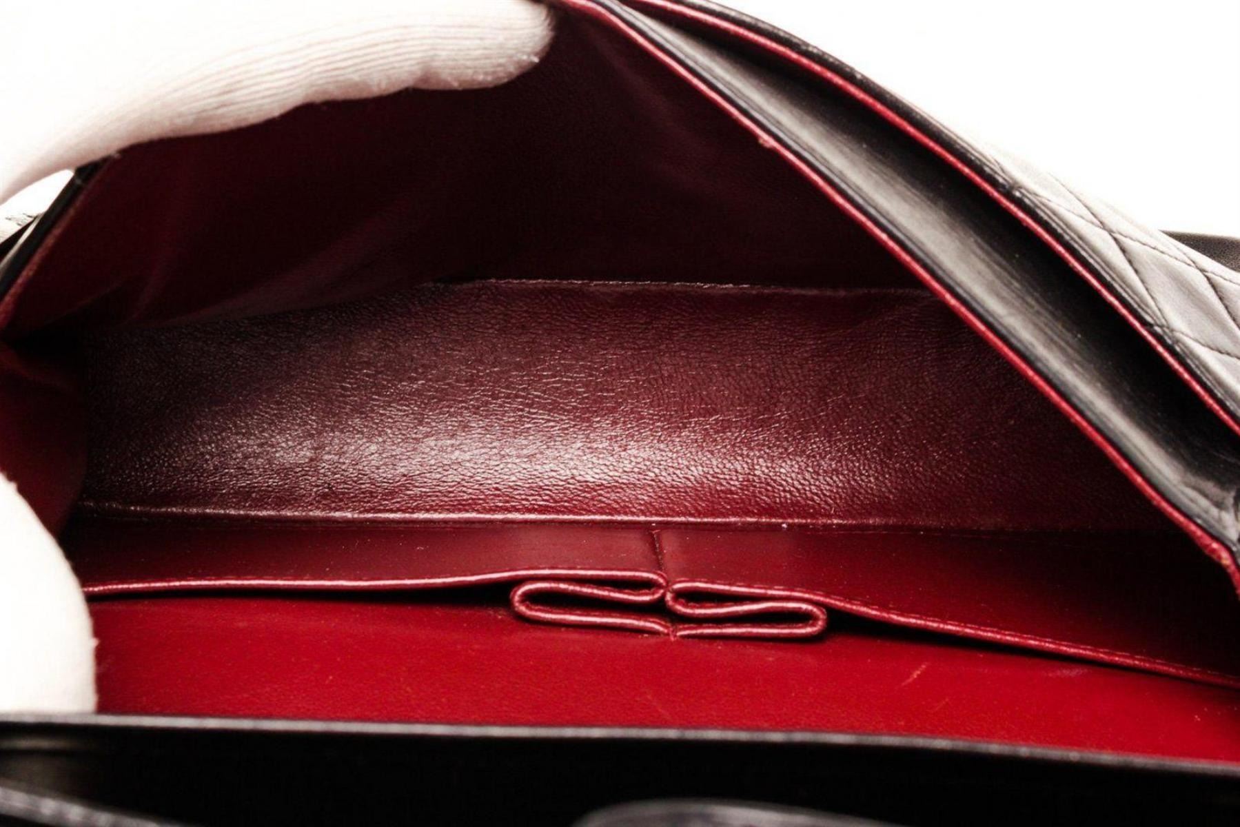 Chanel Black Caviar Leather Classic Double Flap Shoulder Bag with caviar leather, gold-tone hardware, convertible chain-link and leather shoulder strap, single exterior patch pocket at back, single zip pocket, black leather interior, three interior compartments; one with snap closure, dual interior slit pockets and CC turn-lock closure at front flap.