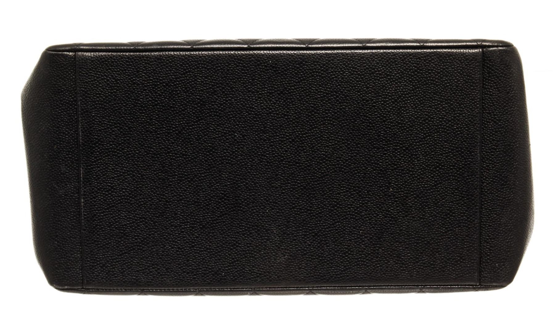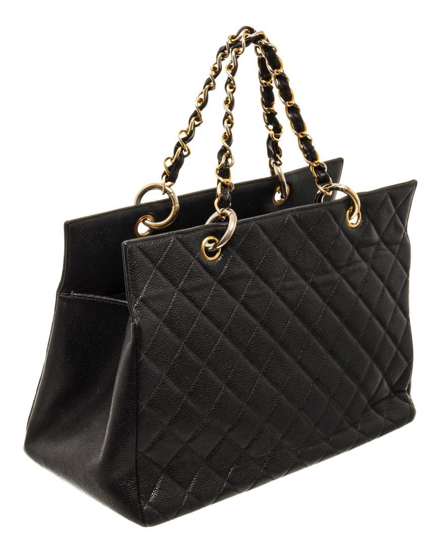 Chanel Black Caviar Quilted Leather Vintage GST. All available information is listed in the description and shown in the photos. Chanel Black Caviar Quilted Leather Vintage GST with chain/leather shoulder strap, two slip pockets, leather lining, gold hardware.