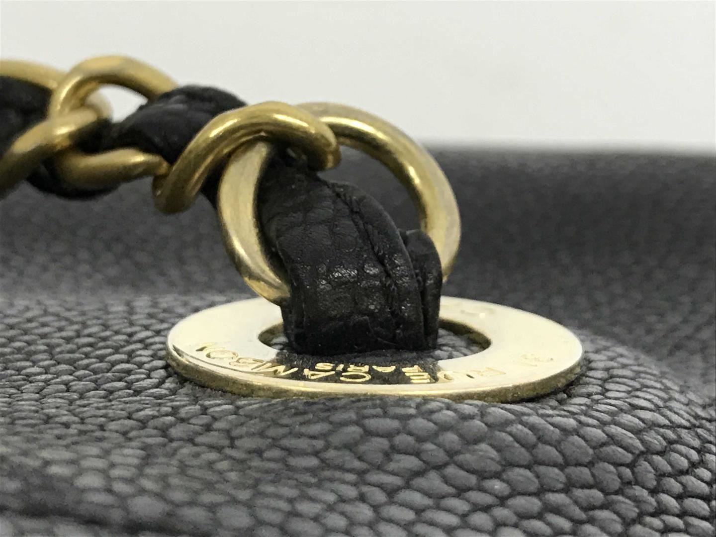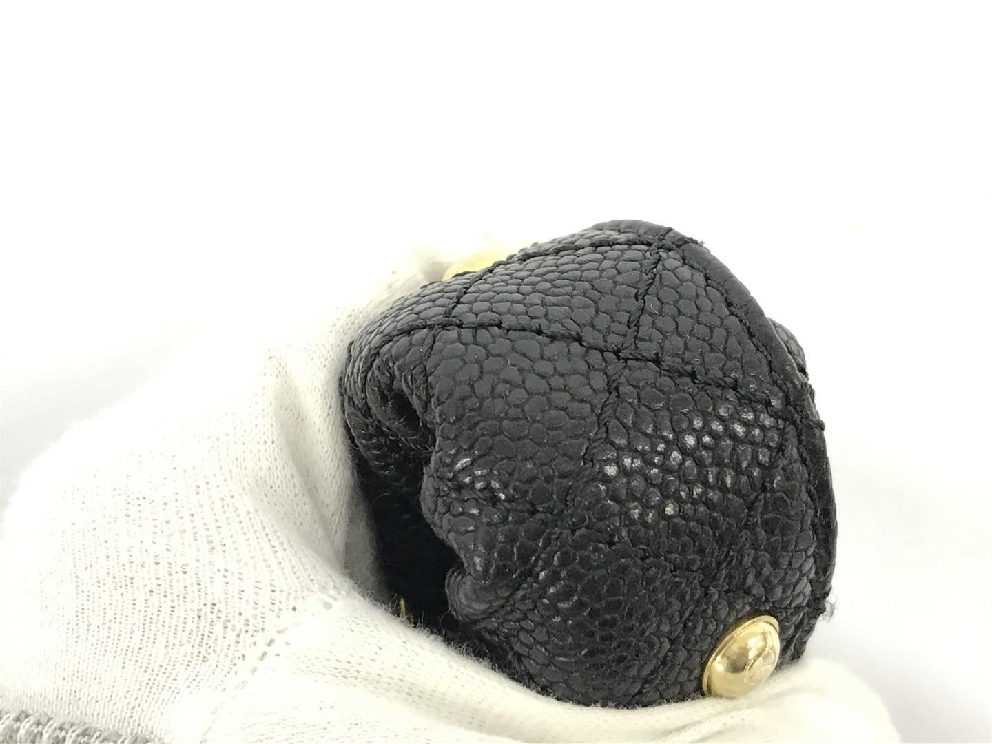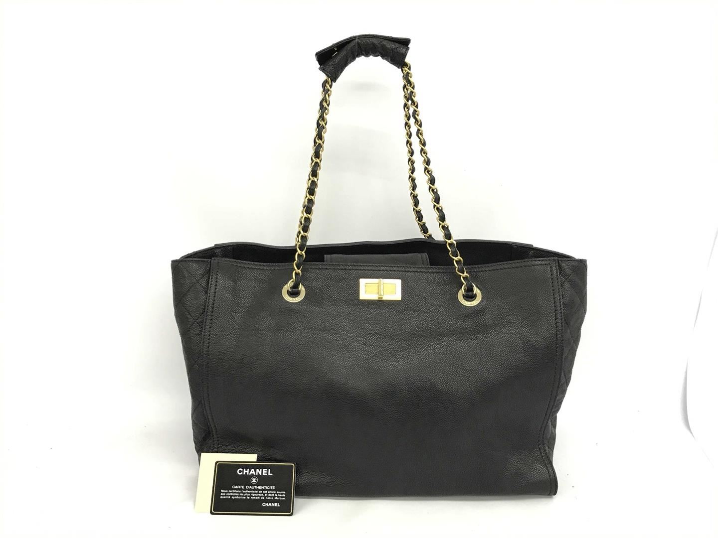Black quilted Caviar leather Chanel Grand Shopping tote with gold-tone hardware, dual chain-link and leather shoulder straps, three interior compartments, tonal grosgrain lining, dual interior pockets, one with zip closure and open top. 14.6" x 6" x 10