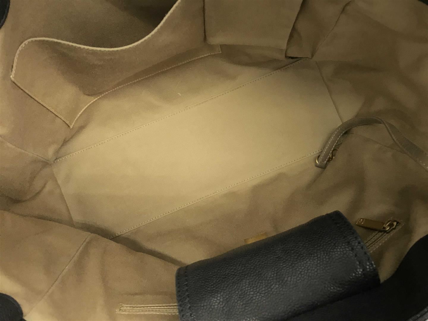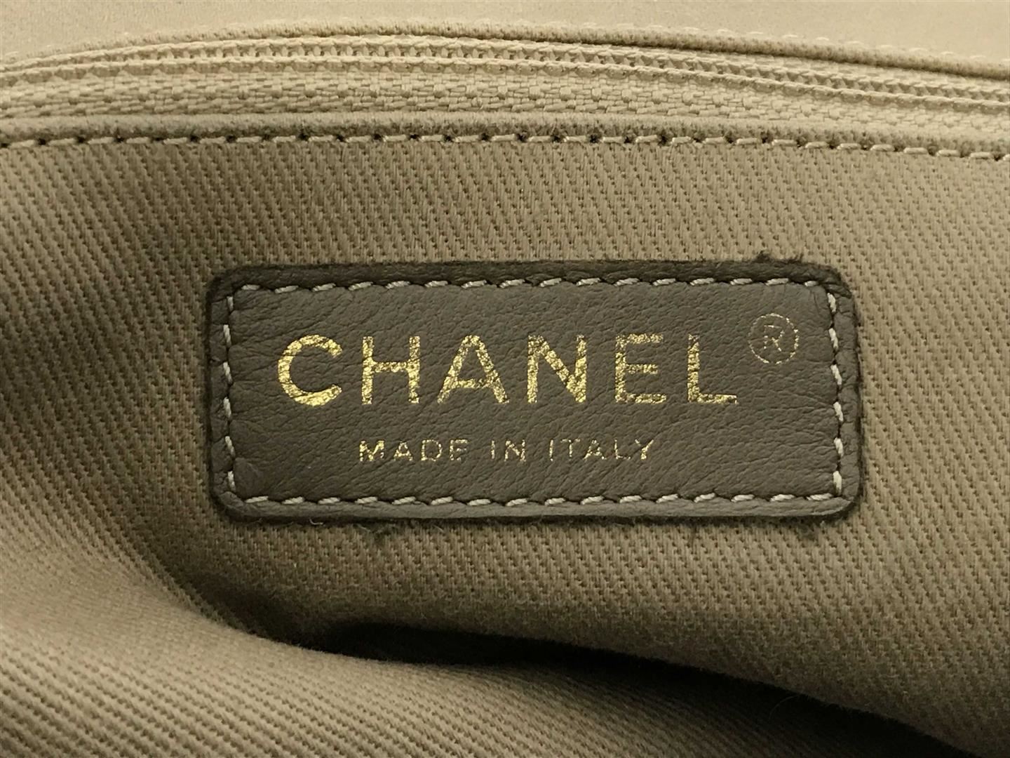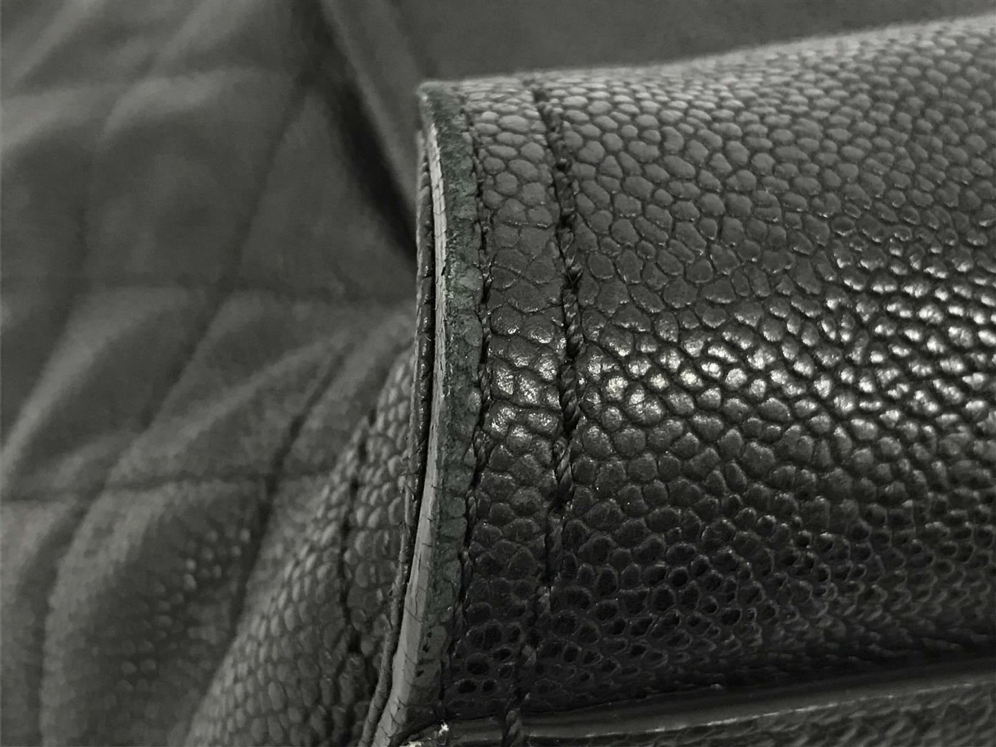 Black quilted Caviar leather Chanel Grand Shopping tote with gold-tone hardware, dual chain-link and leather shoulder straps, three interior compartments, tonal grosgrain lining, dual interior pockets, one with zip closure and open top. 14.6" x 6" x 10