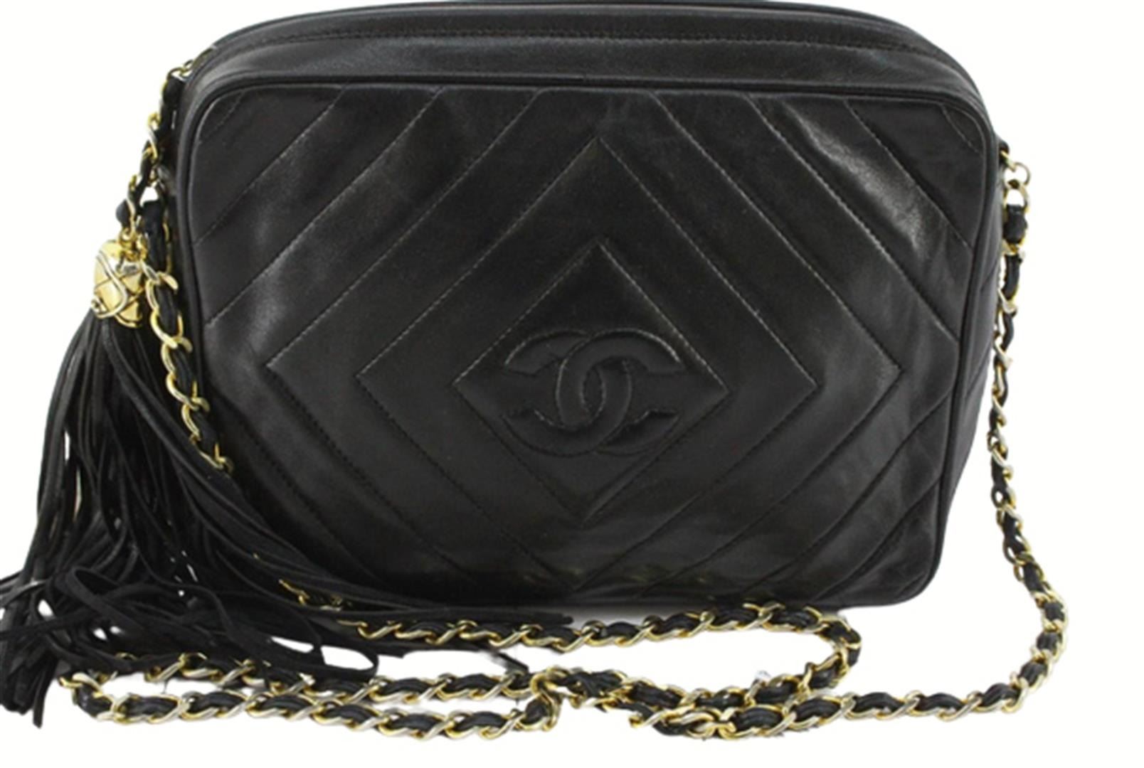 Chanel crossbody bag features black chevron quilted Lambskin leather with black leather fringe attached to shoulder strap, gold-tone hardware, an interlocking CC embossed logo at front, zipped main compartment, black leather lining and one zip pocket insi