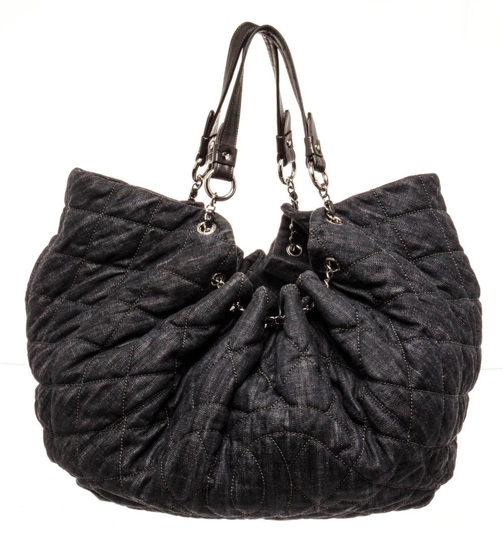Chanel Black Denim CC Cabas XL Tote Bag with denim, gold-tone hardware, trim leather, interior slip pocket, dual top handle and snap closure.
