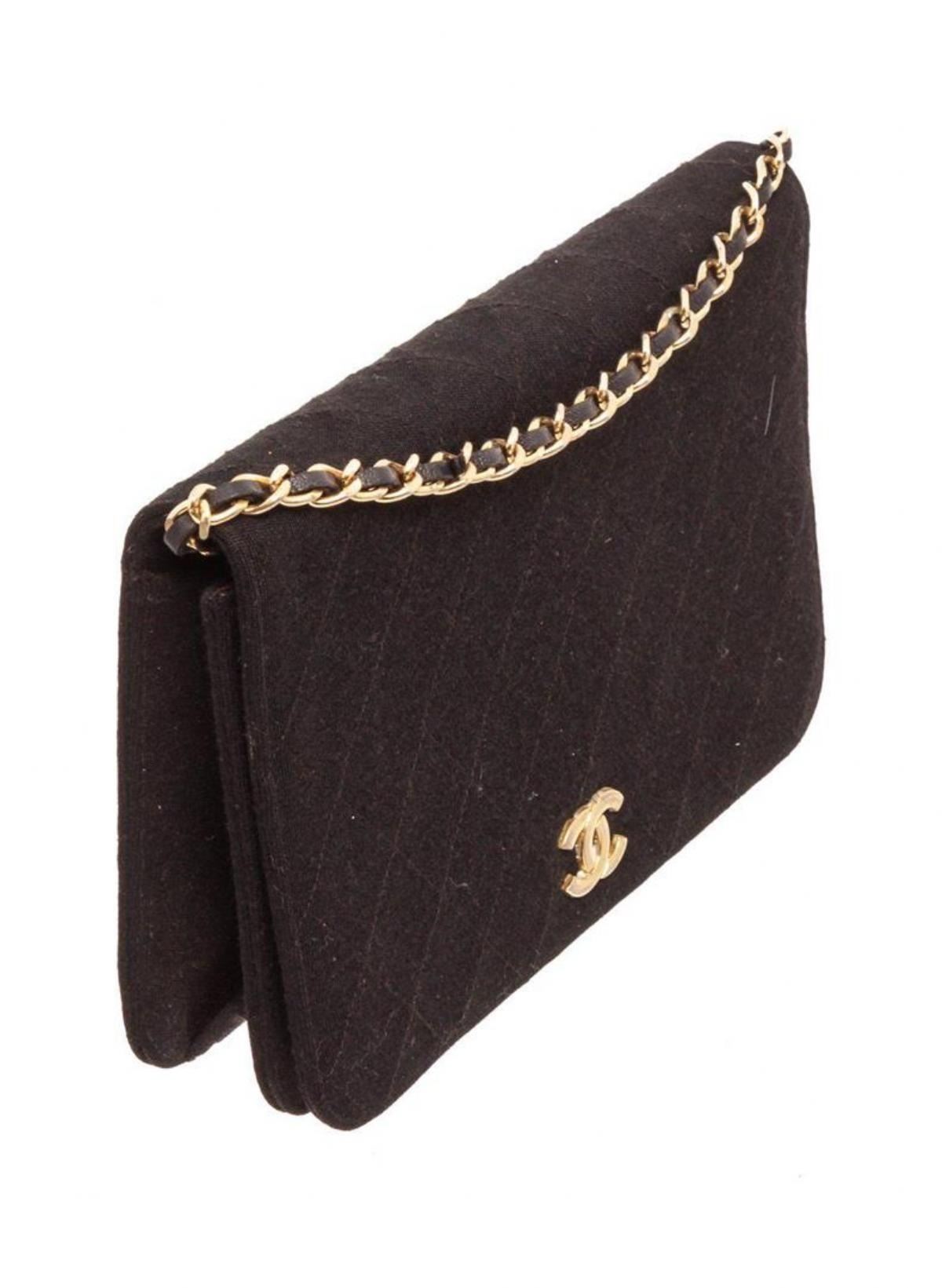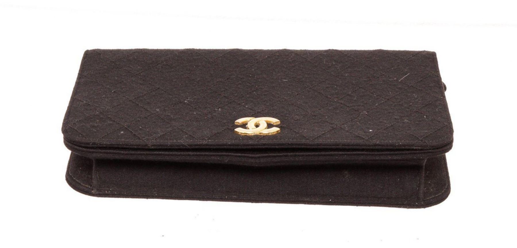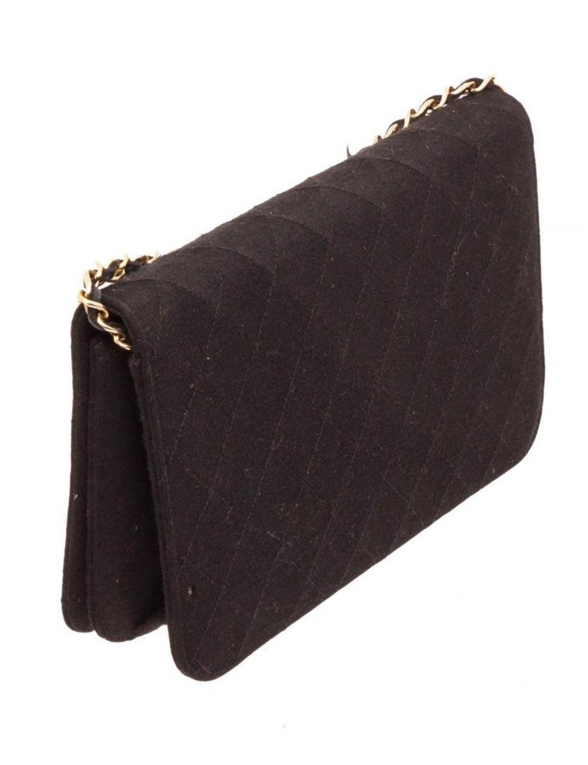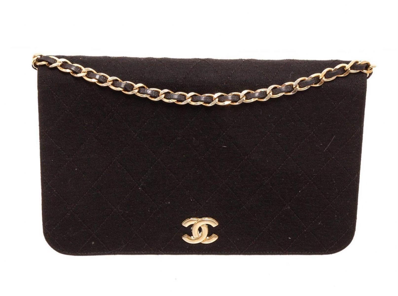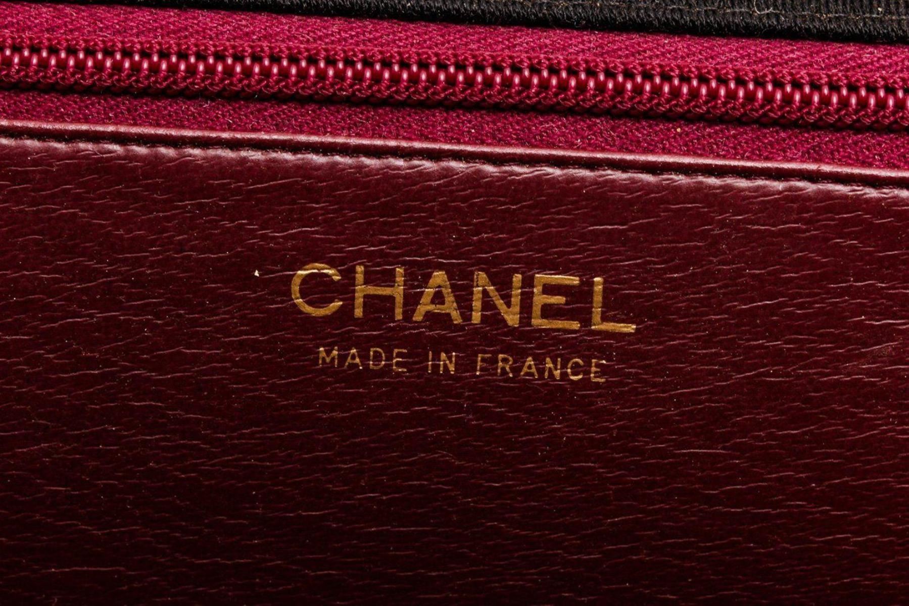 Chanel Black Leather Fabric Full Flap Shoulder Bag with gold-tone hardware, interior zip pockets, nylon lining, chain-link shoulder strap, and flap closure. Please note: Vintage snap professionally repaired.