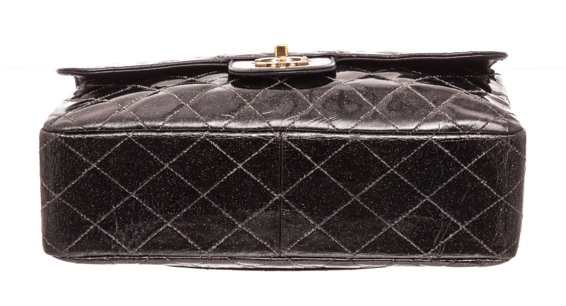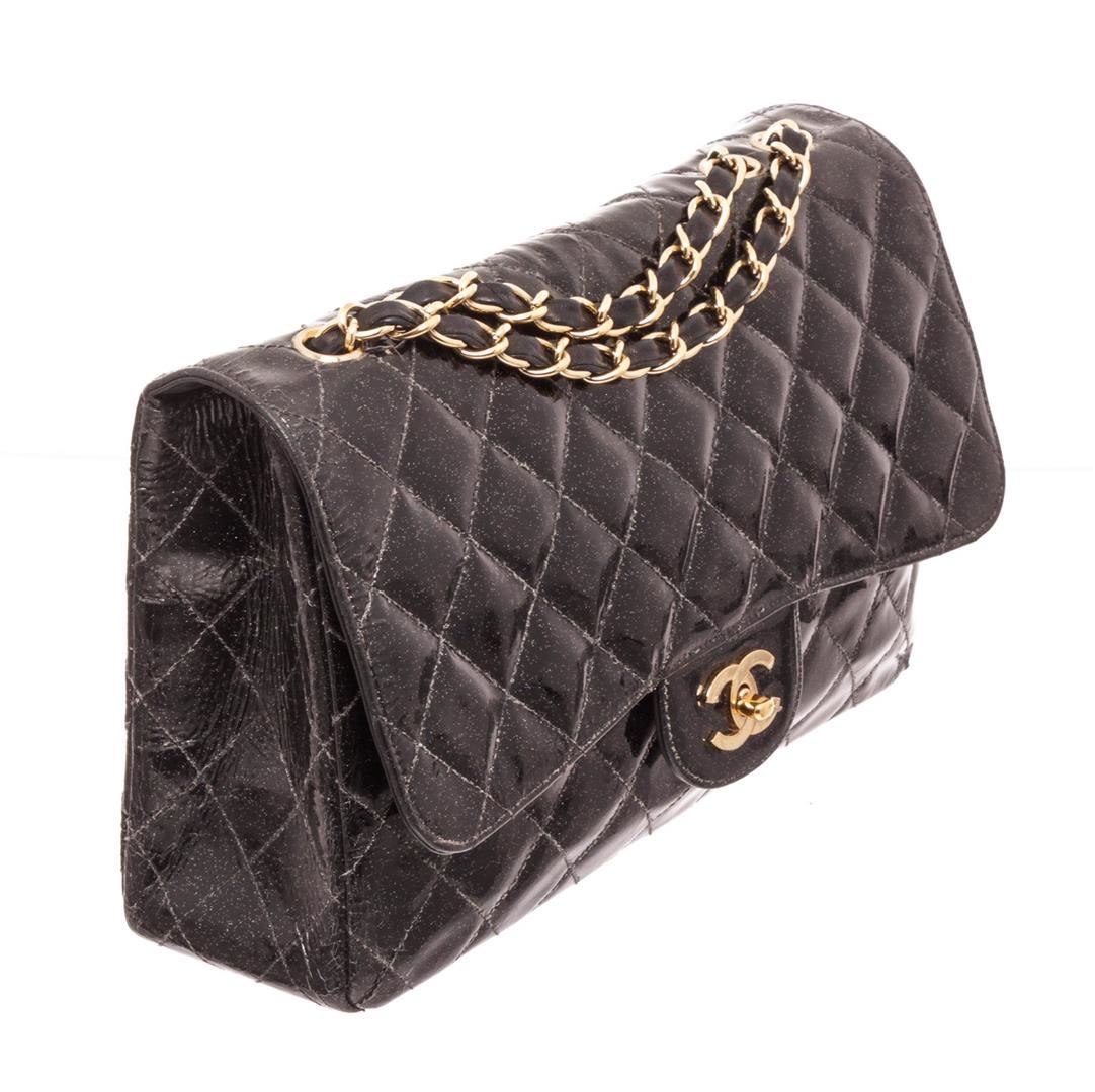 Chanel Black Glitter Patent Leather Jumbo Flap Shoulder Bag. All available information is listed in the description and shown in the photos. Chanel Black Glitter Patent Leather Jumbo Flap Shoulder Bag with material Patent Leather, gold-tone hardware, interior zip pockets, chain-link shoulder strap and turn-lock closure. PLEASE NOTE: creasing and peeling throughout. 31922 Condition: Pre-Owned Good