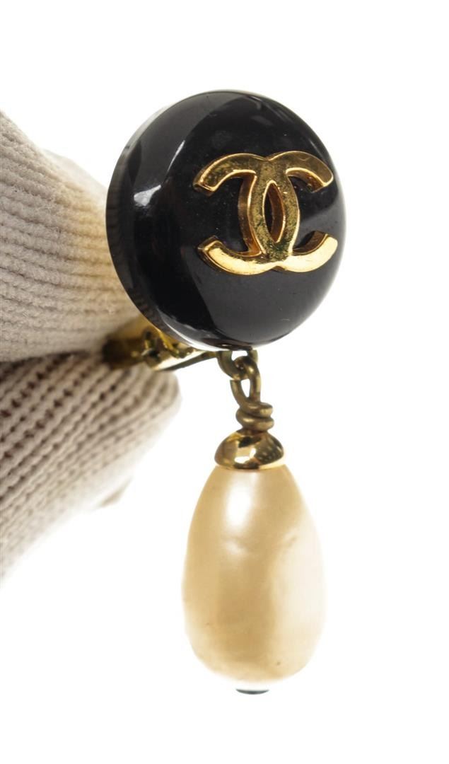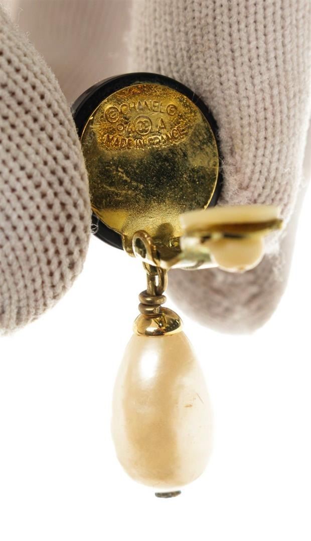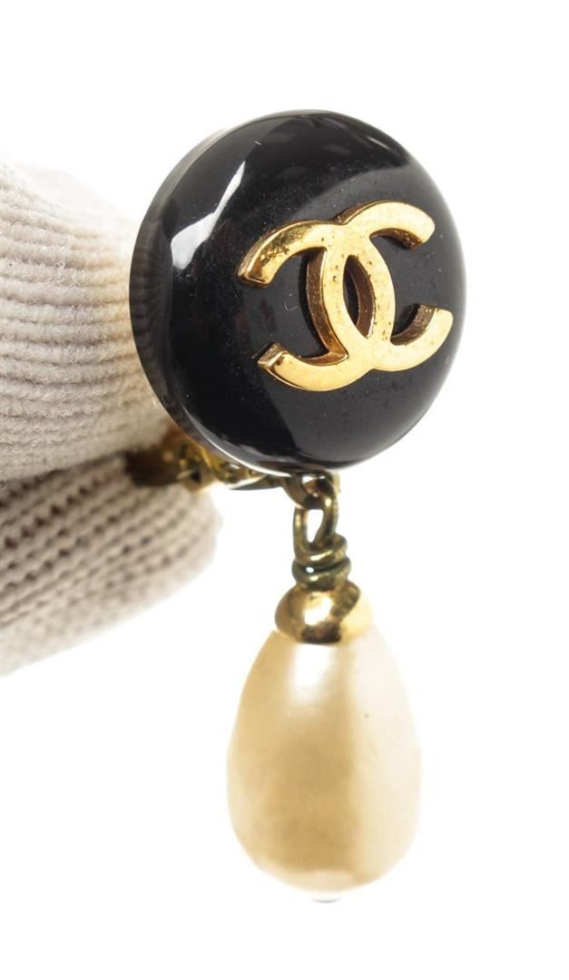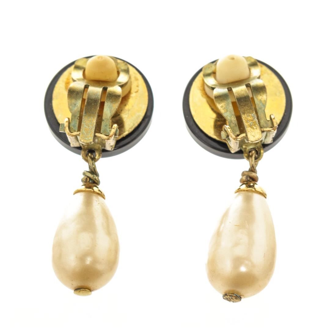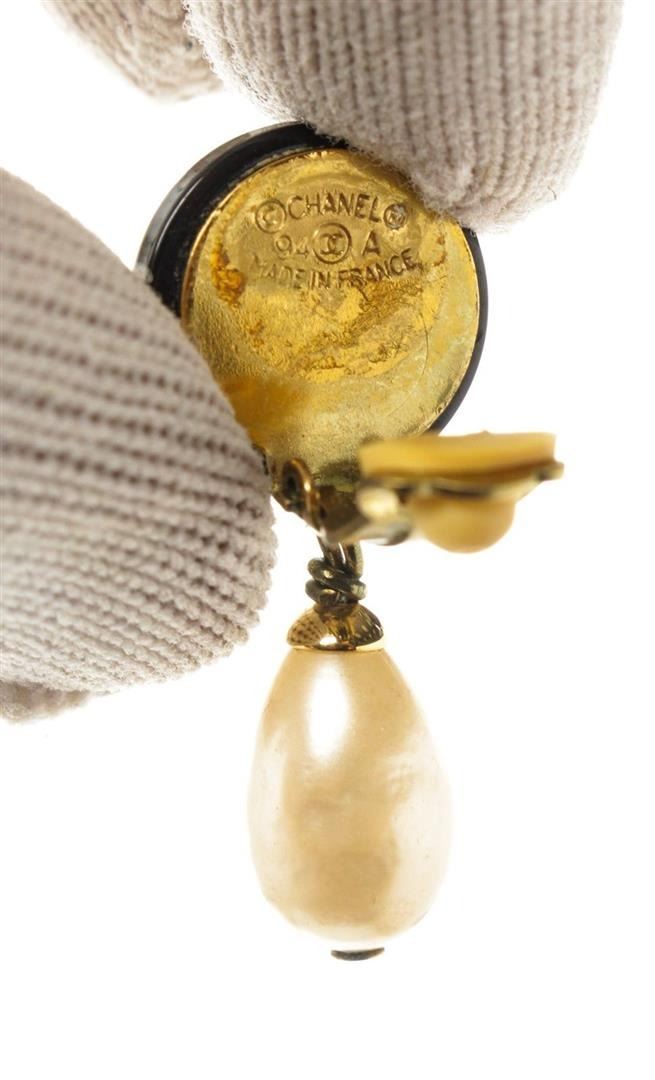 Chanel Black Gold CC Dangle Pearl Earrings with gold-tone hardware.