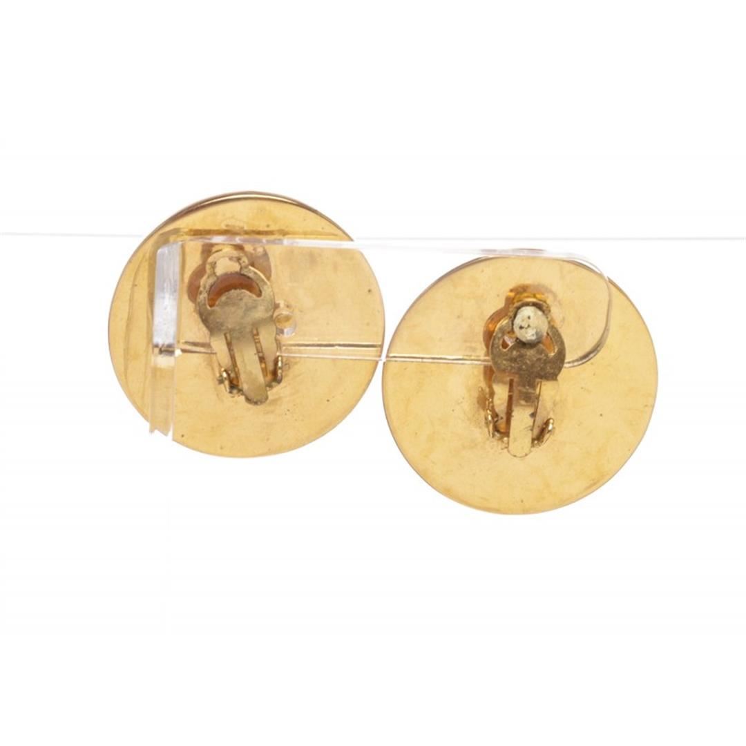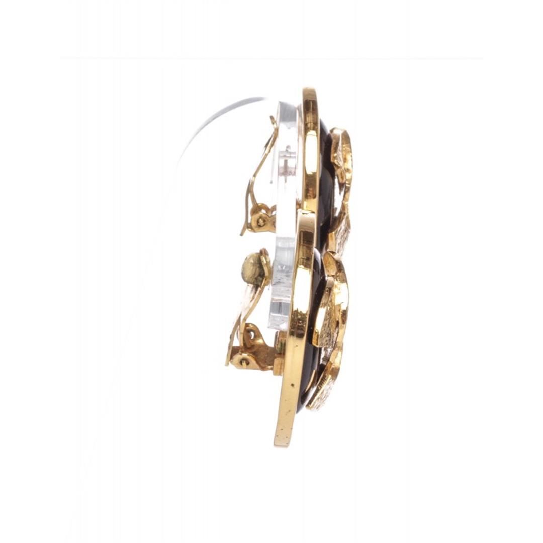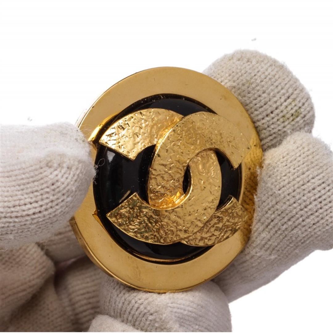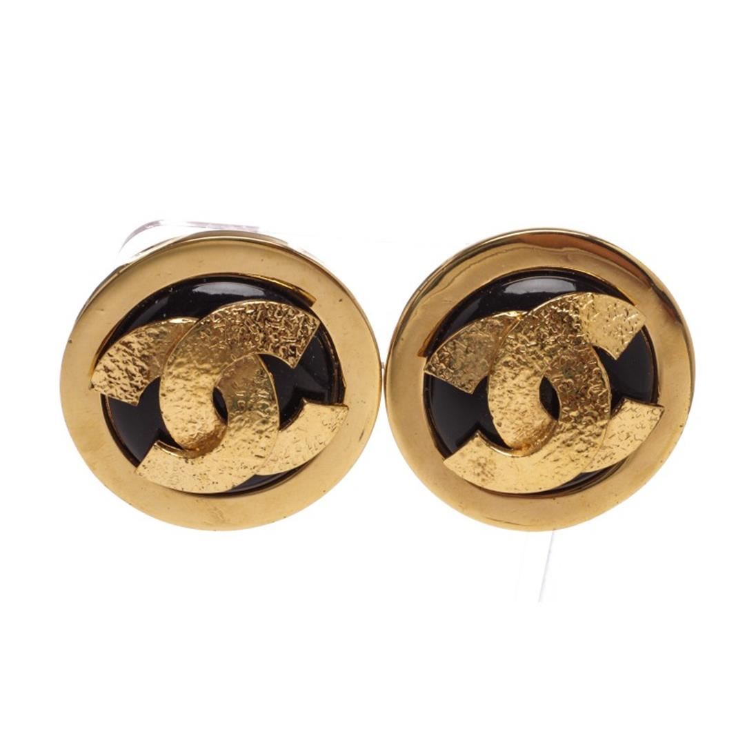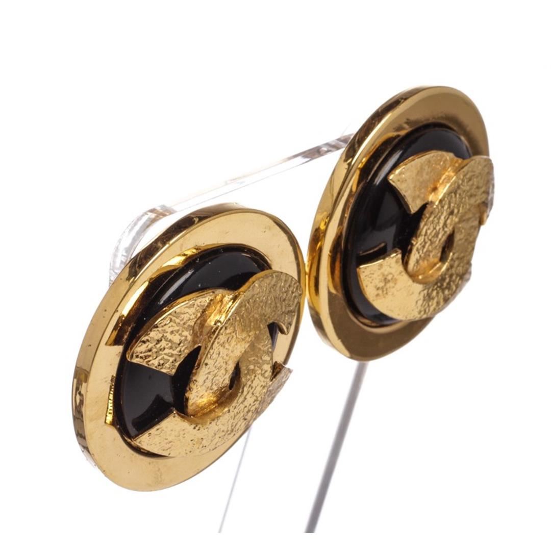 One pair of Chanel Black Gold CC Logo Clip On Disc Earrings. Clip On Backing.