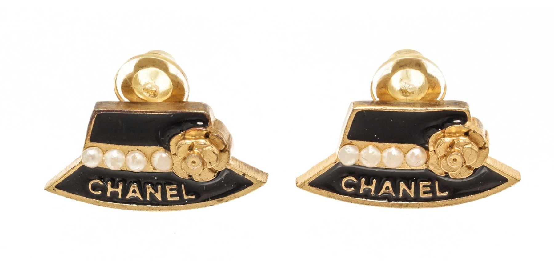 Chanel Black Gold & Pearls Metal Hat Earring. All available information is listed in the description and shown in the photos. chanel black gold & pearls metal hat earring with goldtone and black enamel earrings adorned with faux pearl's.