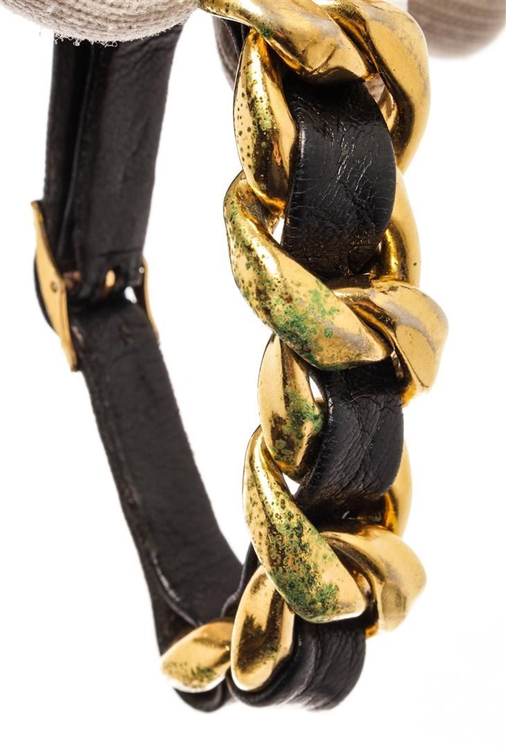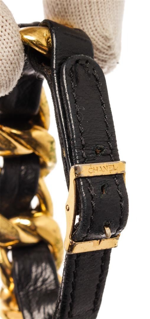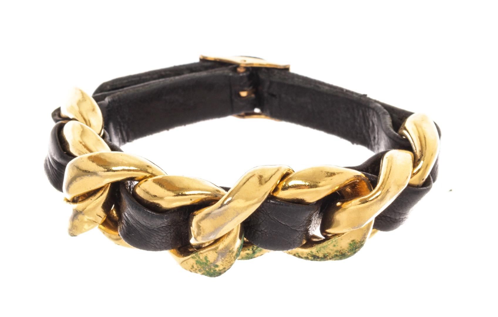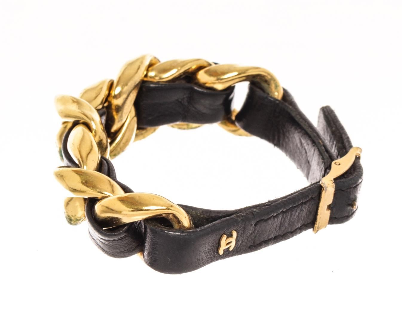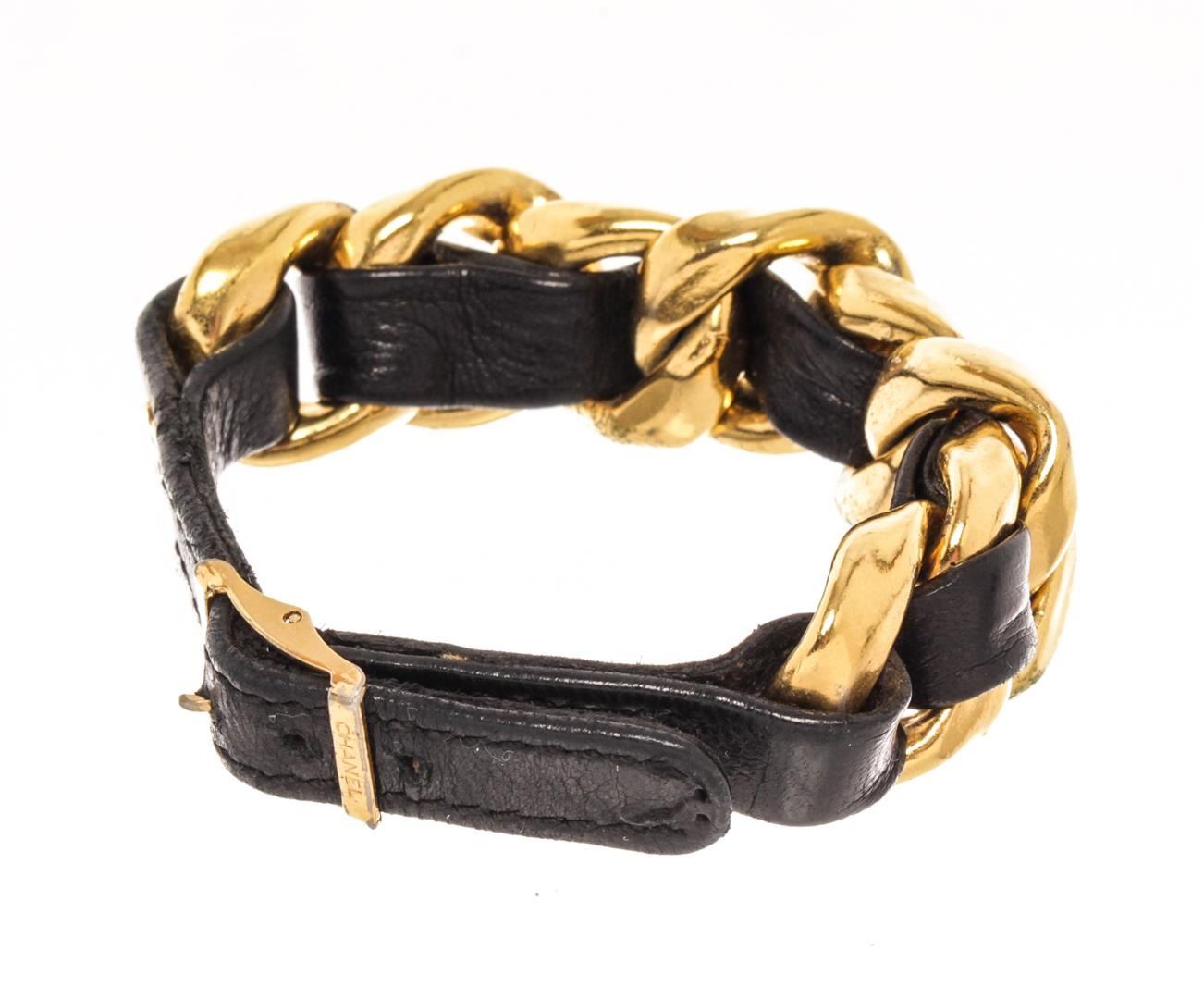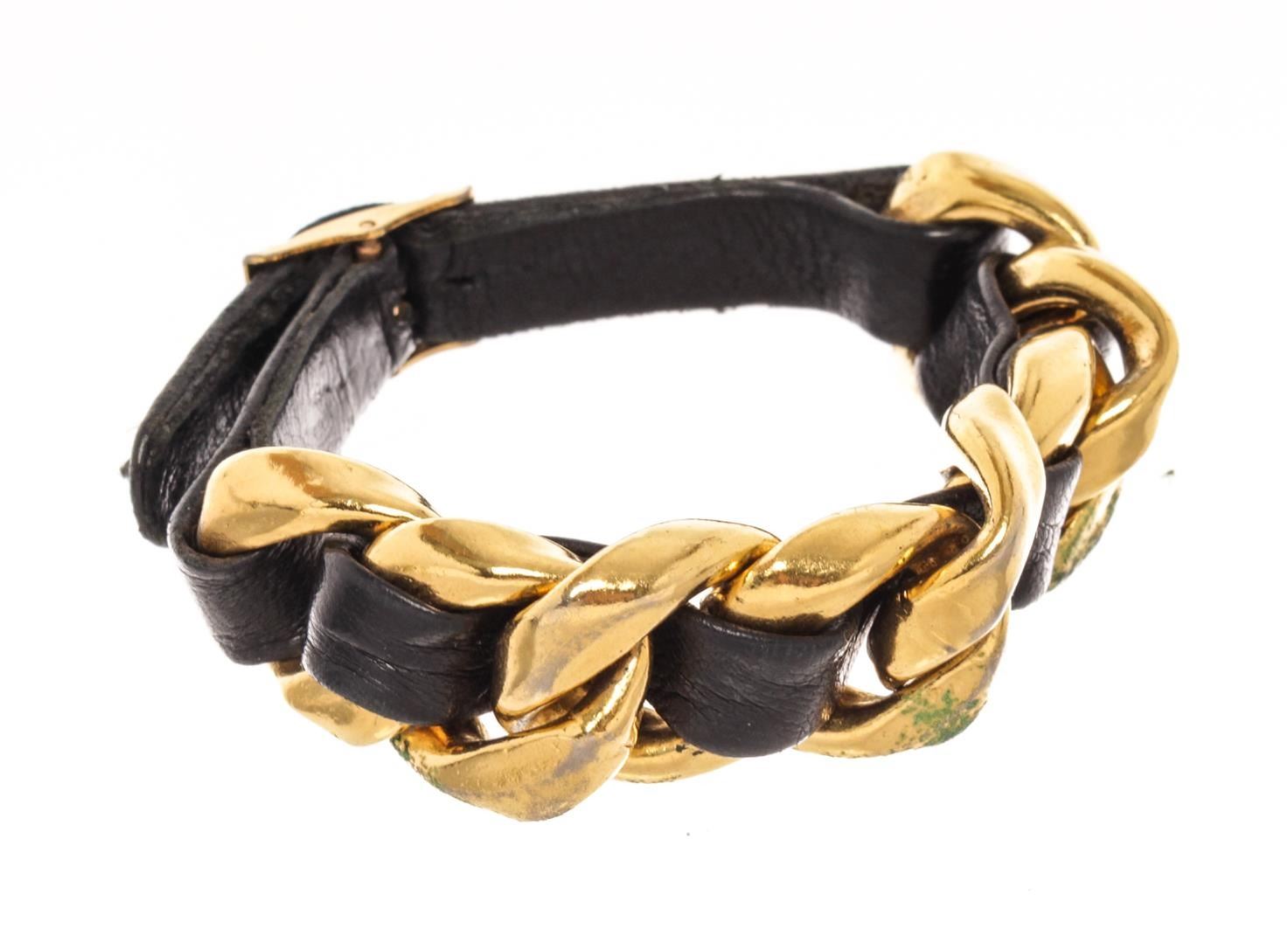 Chanel Black Gold Plated Leather Chain Bracelet. All available information is listed in the description and shown in the photos. Chanel Black Gold Plated Leather Chain Bracelet with black leather, gold-plated hardware, leather and chain-link detailing, black and gold-plated bracelet is finished with an adjustable buckle fastening. Width: 0.7" / 1.8 Cm