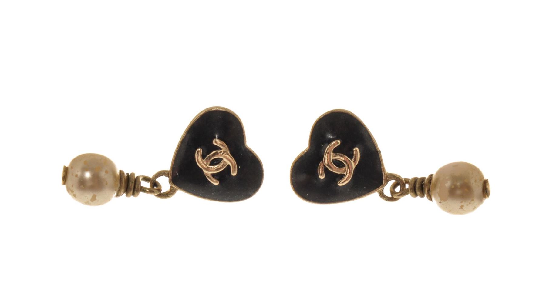 Chanel Black Heart CC Dangle Pearl Earrings. All available information is listed in the description and shown in the photos. Chanel Black Heart CC Dangle Pearl Earrings with faux pearls and gold tone metal hardware.
