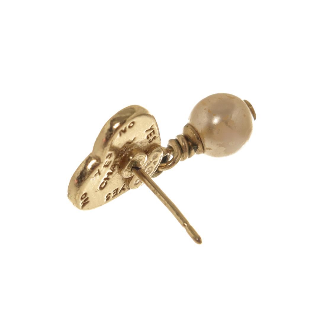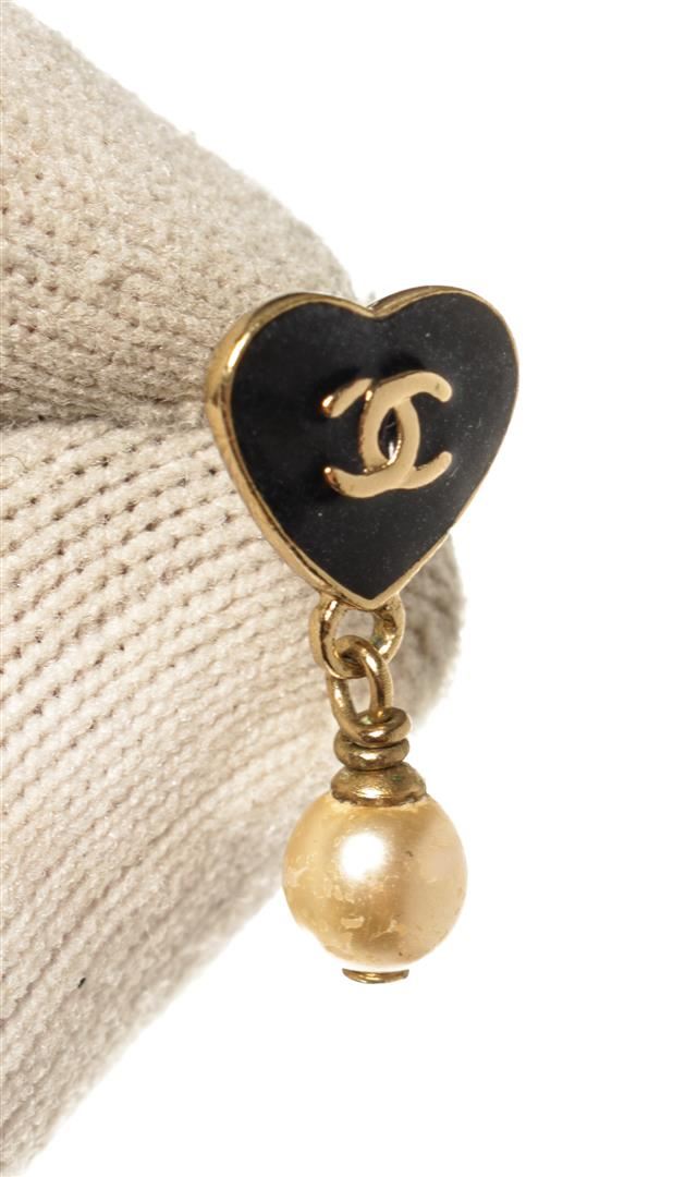 Chanel Black Heart CC Dangle Pearl Earrings. All available information is listed in the description and shown in the photos. Chanel Black Heart CC Dangle Pearl Earrings with faux pearls and gold tone metal hardware.