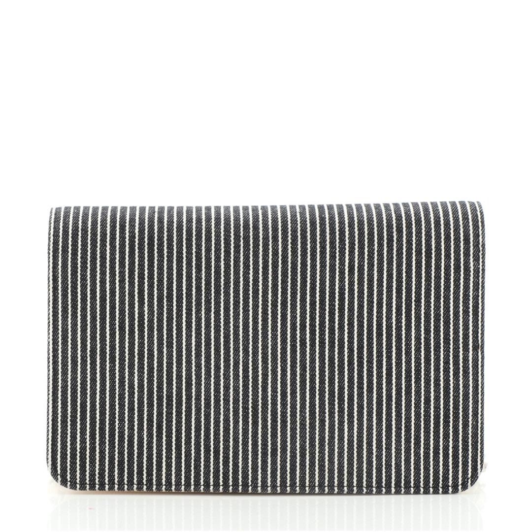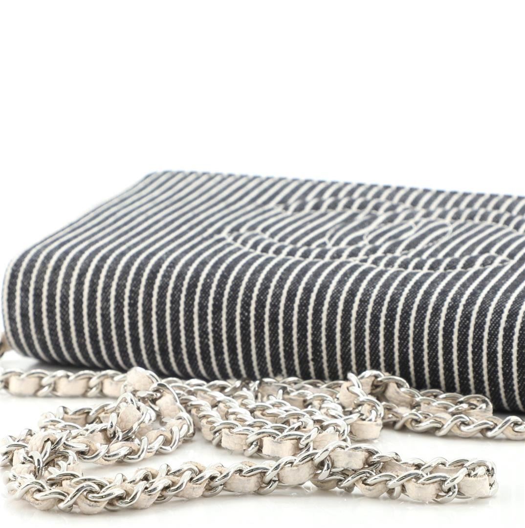 Chanel Black Ivory Striped Denim Timeless Wallet on Chain. All available information is listed in the description and shown in the photos. Chanel Wallet on Chain features black and ivory denim body, CC logo on the front, silver-tone hardware, a long interwoven strap that can be used on the shoulder, one main compartment and several slots for card storage for the interior made from ivory leather.