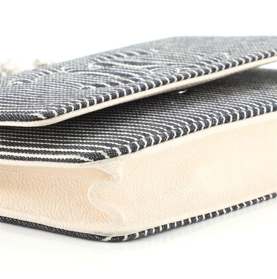 Chanel Black Ivory Striped Denim Timeless Wallet on Chain. All available information is listed in the description and shown in the photos. Chanel Wallet on Chain features black and ivory denim body, CC logo on the front, silver-tone hardware, a long interwoven strap that can be used on the shoulder, one main compartment and several slots for card storage for the interior made from ivory leather.
