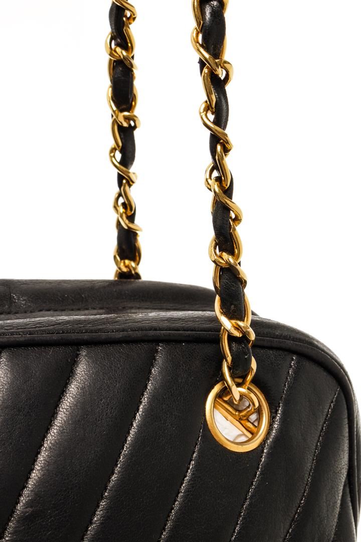 One Chanel Black Lambskin Chevron Camera Bag. Item is sold AS-IS. All available information is listed in the description and shown in the photo. Chanel black lambskin chevron camera back with red leather lining, gold-tone hardware, zip closure, one interior zip pocket, one front slip pocket, two long chains with leather shoulder paddings, and an interlocking CC logo as zipper tab. There is a stain and scratches on the lining. Please refer to photos. Height: 8" Width: 3.5" Length: 11", Handle Drop: / 20.32 x 8.89 x 27.94 Cm