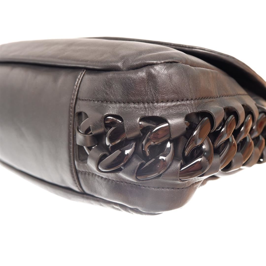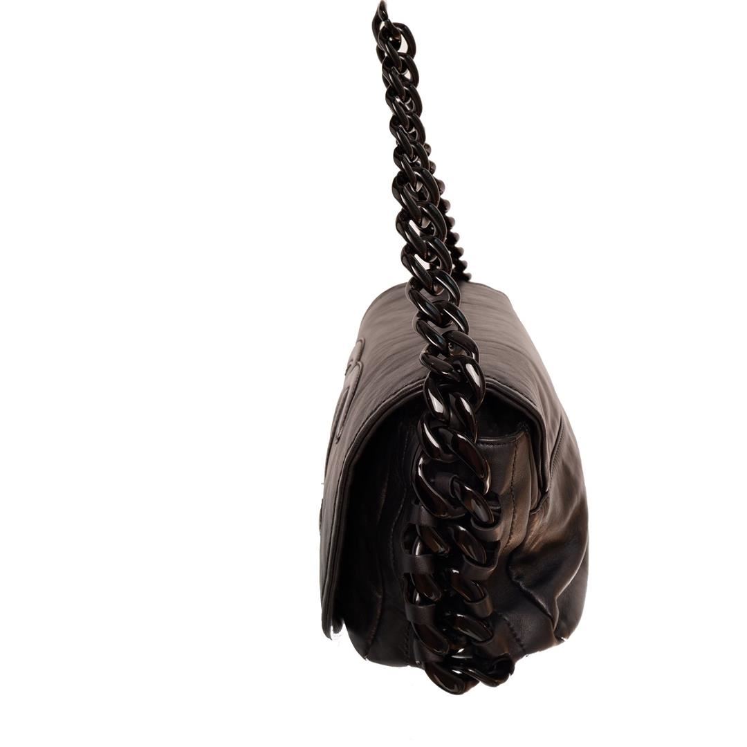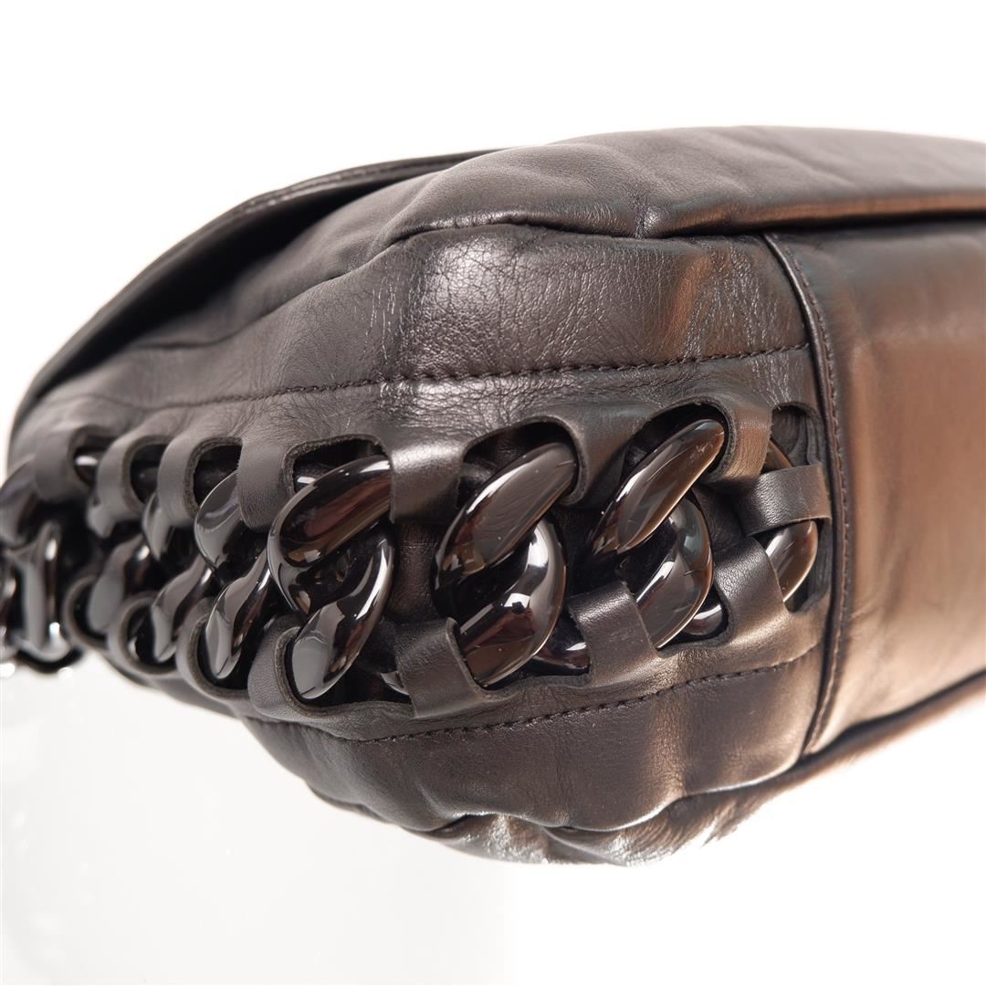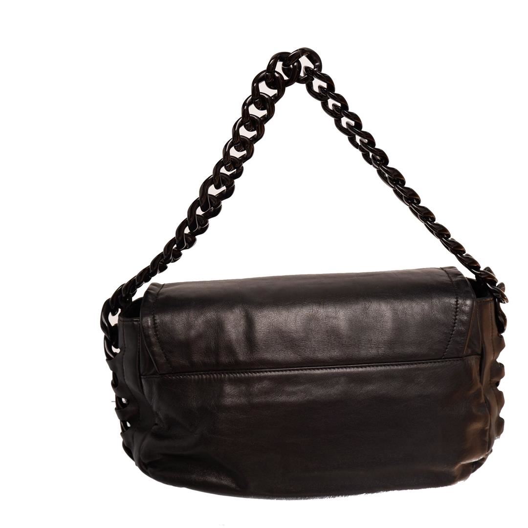 Chanel Modern Chain flap bag features black Lambskin leather with glossy interlocking CC logo made from black patent leather stitched on front. Black chunky resin chain is braided throughout the side and bottom panels of the bag and this black resin chain also becomes the shoulder strap. It also features magnetic snap closure inside bag, an interior with side pockets and gray satin lining. Handle Drop 7", Height 9", Width 12", Depth 5"