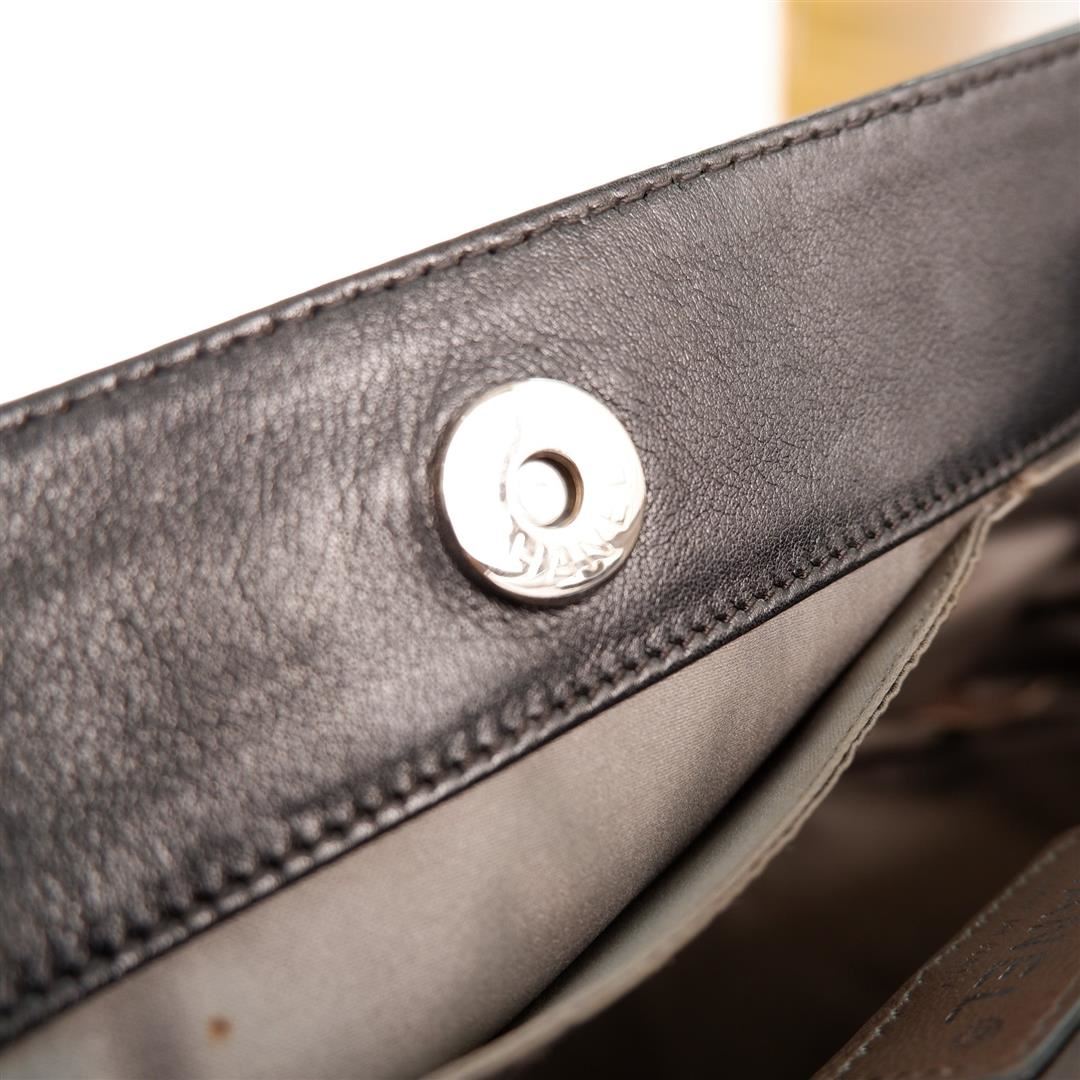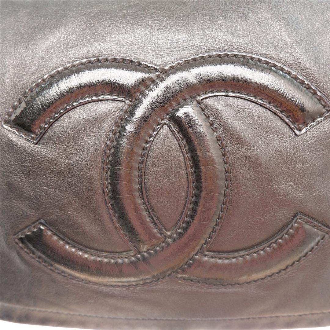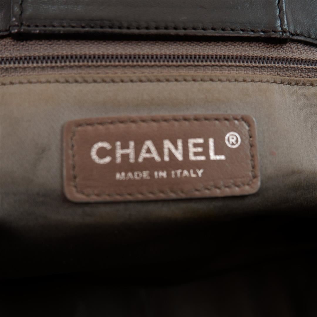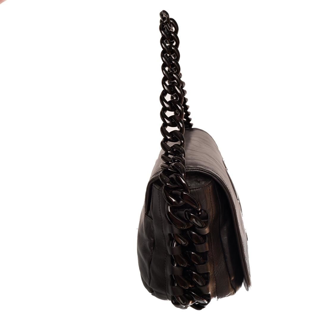 Chanel Modern Chain flap bag features black Lambskin leather with glossy interlocking CC logo made from black patent leather stitched on front. Black chunky resin chain is braided throughout the side and bottom panels of the bag and this black resin chain also becomes the shoulder strap. It also features magnetic snap closure inside bag, an interior with side pockets and gray satin lining. Handle Drop 7", Height 9", Width 12", Depth 5"