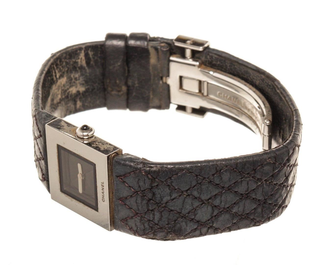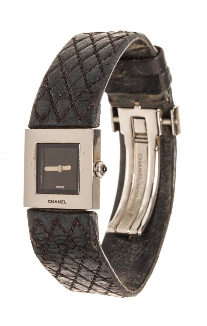 Chanel Black Leather Acier Quartz Watch with leather, gold-tone hardware and turn lock closure.