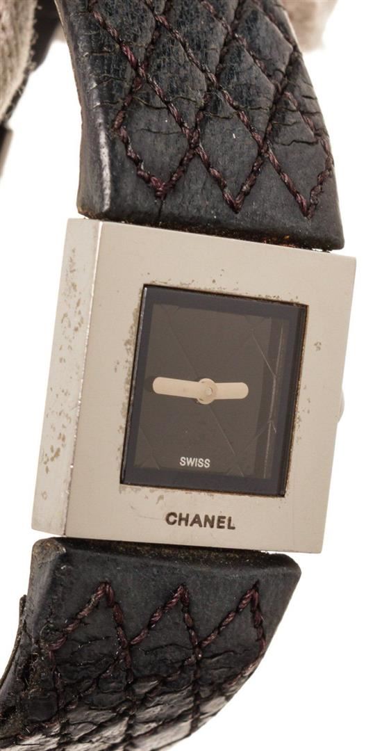 Chanel Black Leather Acier Quartz Watch with leather, gold-tone hardware and turn lock closure.