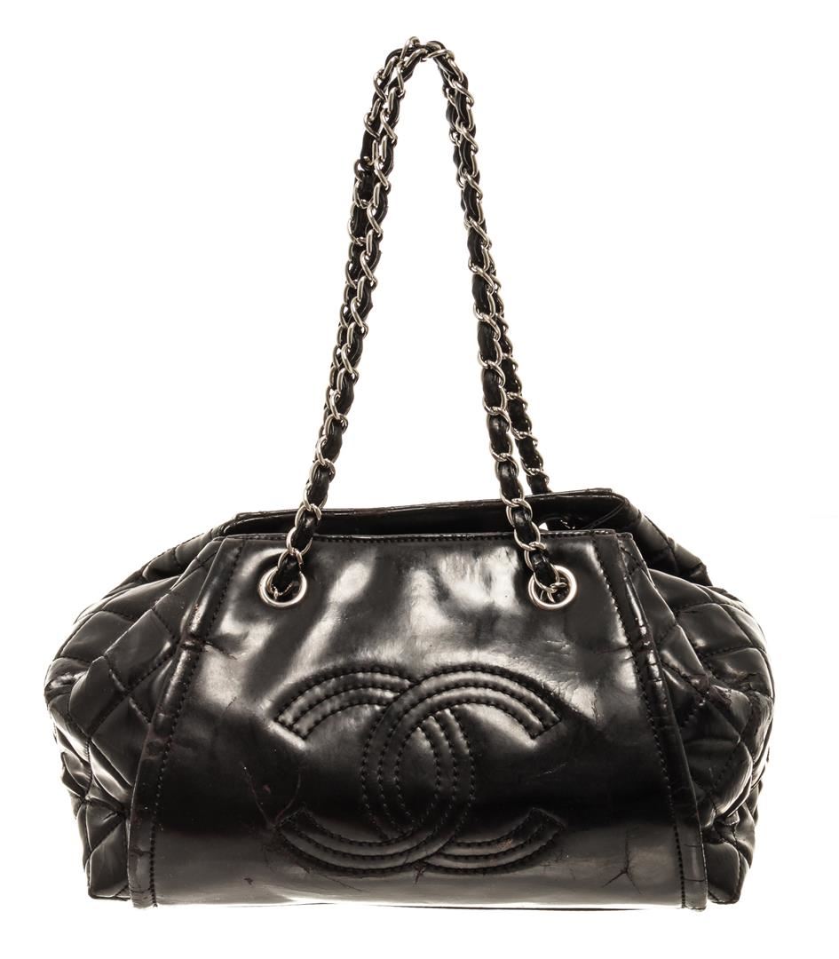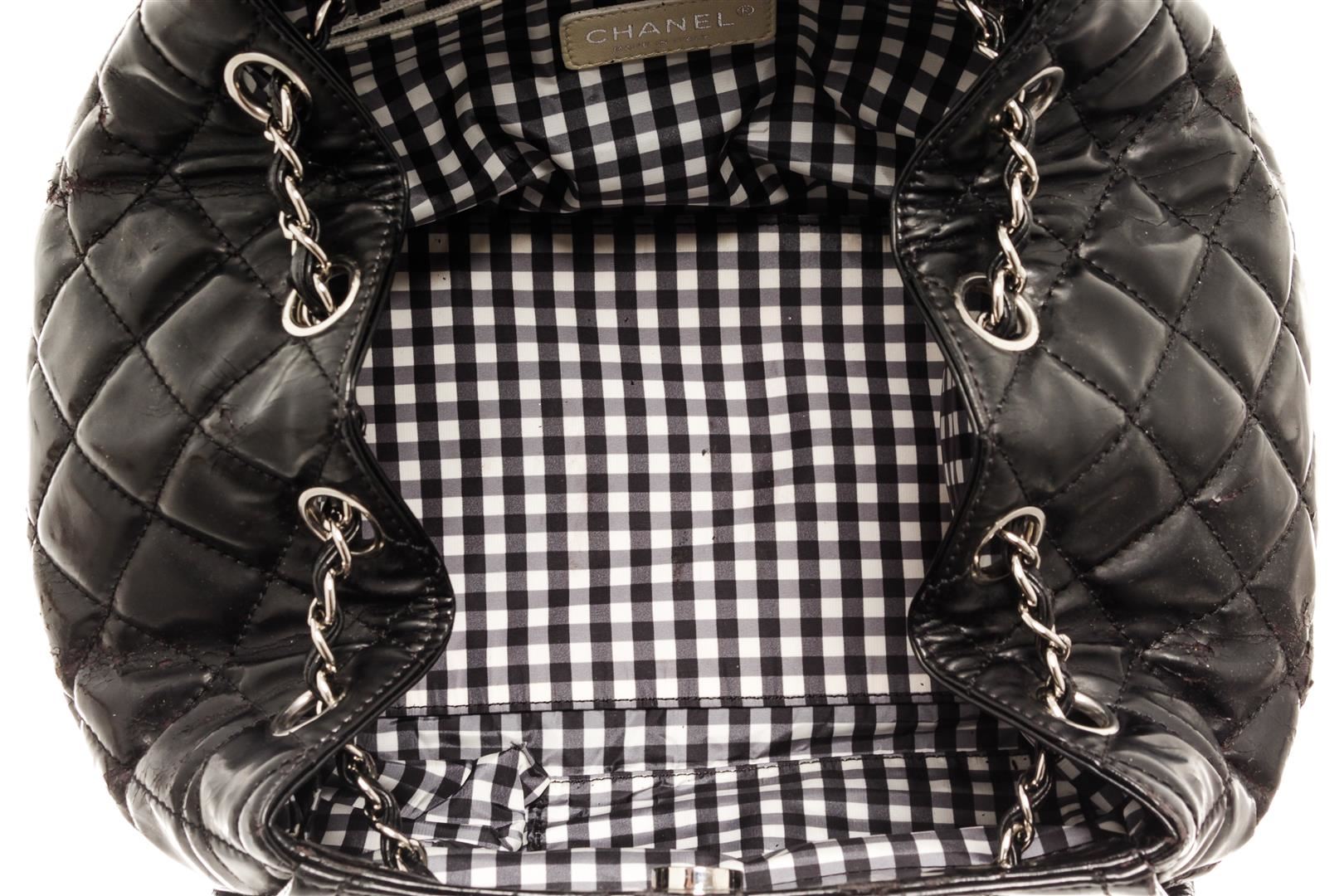 Chanel Black Leather CC Bowler Bag. All available information is listed in the description and shown in the photos. Chanel black leather CC bowler bag with black vinyl exterior, the interlocking CC logo stitched on the front, quilted leather sides, silver-tone hardware, two shoulder straps with leather and chain interlinked, black and white plaid lining, and drawstring closure. There are some markings on the bottom and around the exterior, peeling on the strap. Please refer to photos. length: 9.50 in, Height: 8.75 in, Width: 6.50 in, Drop: 8.00 in / 24.13 x 22.22 x 20.32 Cm