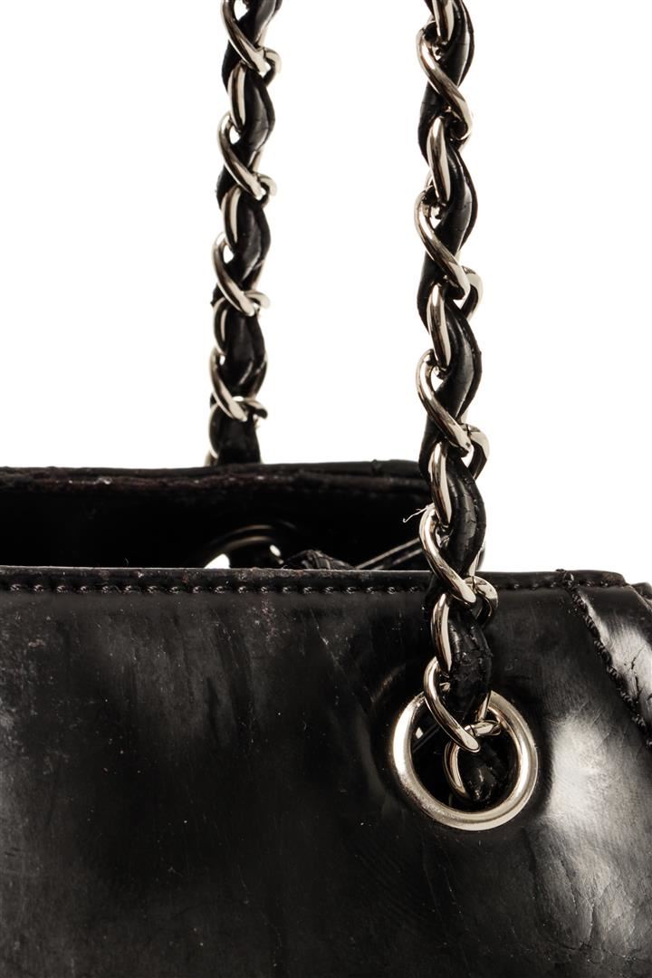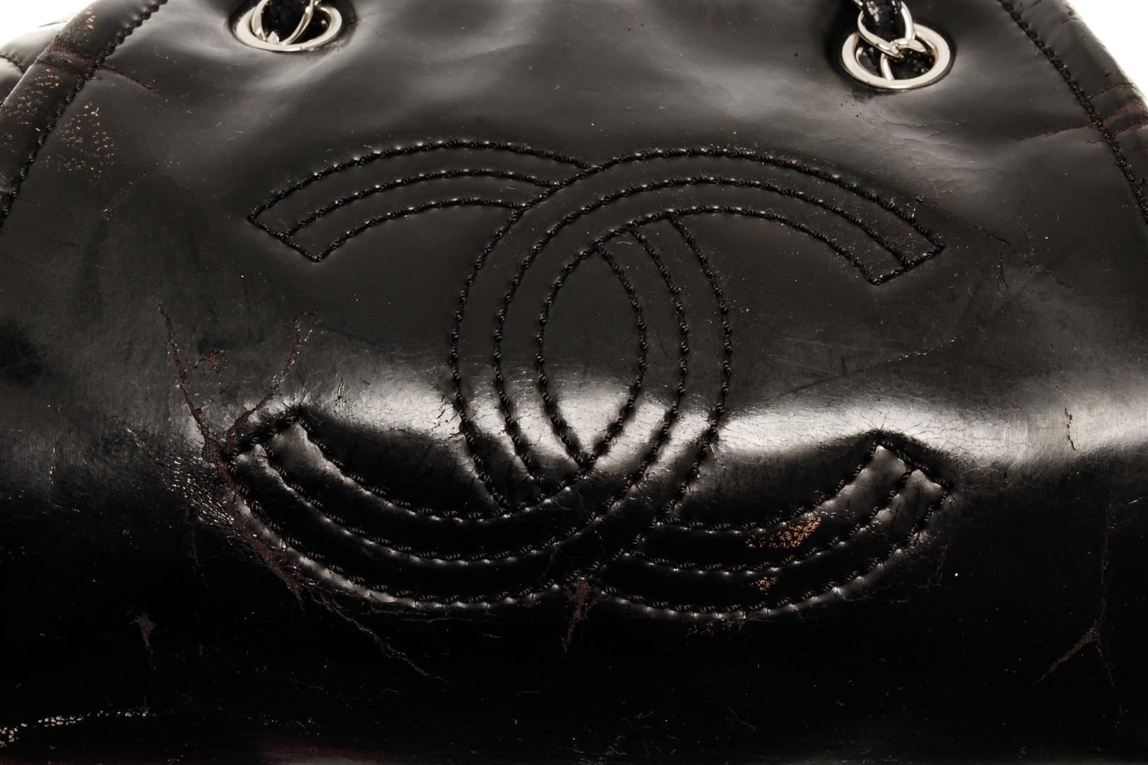 Chanel Black Leather CC Bowler Bag. All available information is listed in the description and shown in the photos. Chanel black leather CC bowler bag with black vinyl exterior, the interlocking CC logo stitched on the front, quilted leather sides, silver-tone hardware, two shoulder straps with leather and chain interlinked, black and white plaid lining, and drawstring closure. There are some markings on the bottom and around the exterior, peeling on the strap. Please refer to photos. length: 9.50 in, Height: 8.75 in, Width: 6.50 in, Drop: 8.00 in / 24.13 x 22.22 x 20.32 Cm