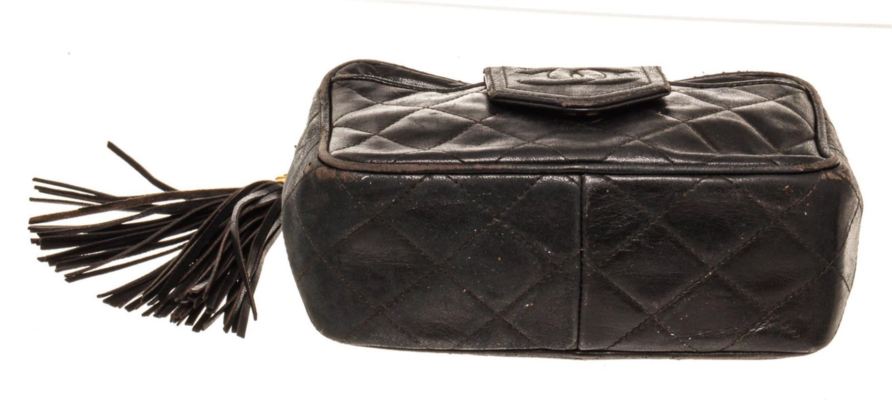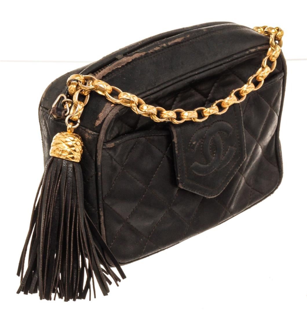 Chanel Black Leather CC Camera Shoulder Bag. All available information is listed in the description and shown in the photos. Chanel Black Leather CC Camera Shoulder Bag with leather, gold-tone hardware, interior slip pocket, chain shoulder strap and zipper closure. Vintage condition, worn, creased, peeling, piping exposed.
