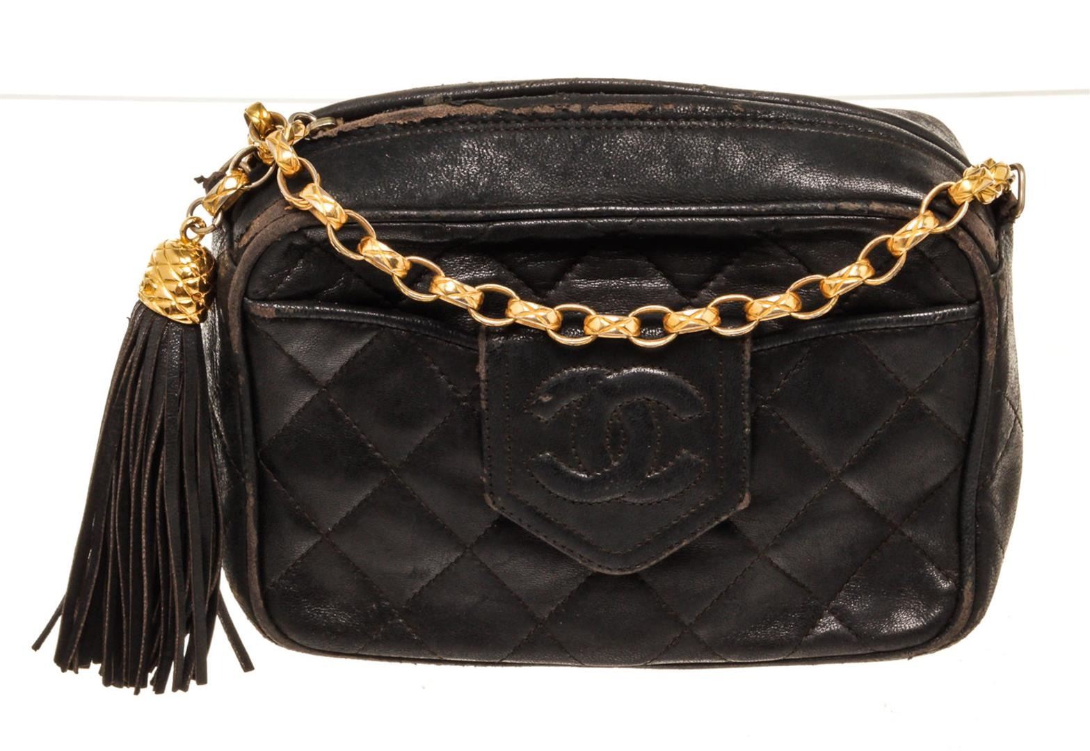 Chanel Black Leather CC Camera Shoulder Bag. All available information is listed in the description and shown in the photos. Chanel Black Leather CC Camera Shoulder Bag with leather, gold-tone hardware, interior slip pocket, chain shoulder strap and zipper closure. Vintage condition, worn, creased, peeling, piping exposed.