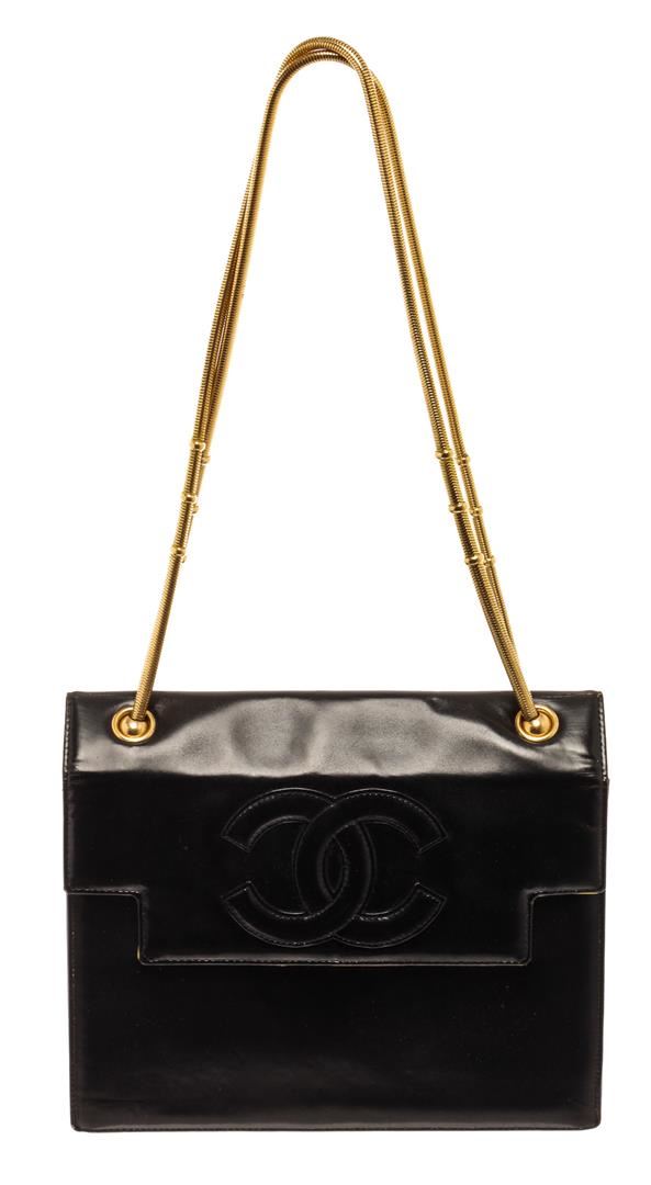 Chanel Black Leather CC Shoulder Bag. All available information is listed in the description and shown in the photos. Chanel Black Leather CC Shoulder Bag with double gold snake chain, gold-tone hardware, heavy gold chain straps, structured patent body with lambskin cc logo and leather lined interior, non-adjustable strap drop, magnetic clasp closure. Height: 10" Width: 8" Depth: 3.25", Drop: 12" / 25.4 x 20.32 x 8.25 cm