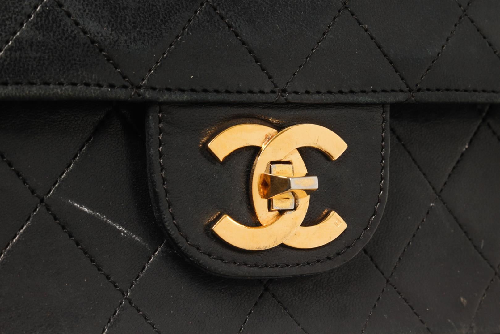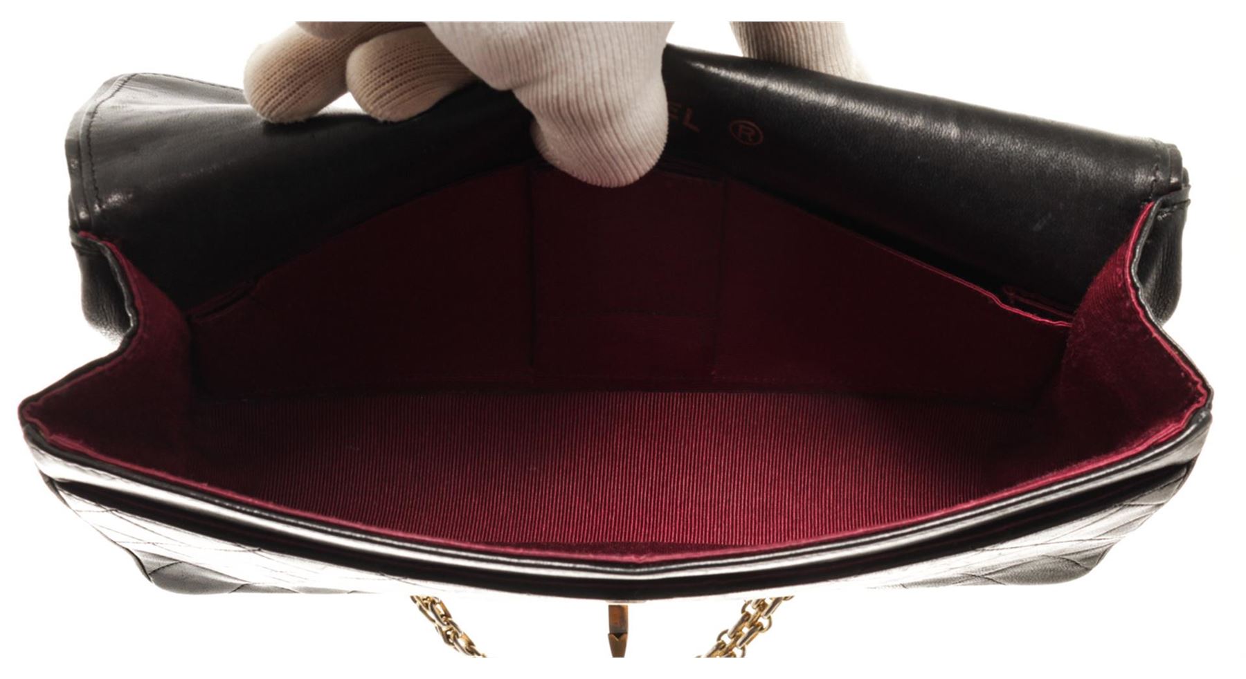 One Chanel Black Leather Chain Double Flap Shoulder Bag. Item is sold AS-IS. All available information is listed in the description and shown in the photo. chanel black leather chain double flap shoulder bag with leather, gold-tone hardware, interior slip pocket, chain shoulder strap and snap closure. Height: 7" Width: 2" Depth: 10" , Handle Drop: / 17.78 x 5.08 x 25.4 Cm