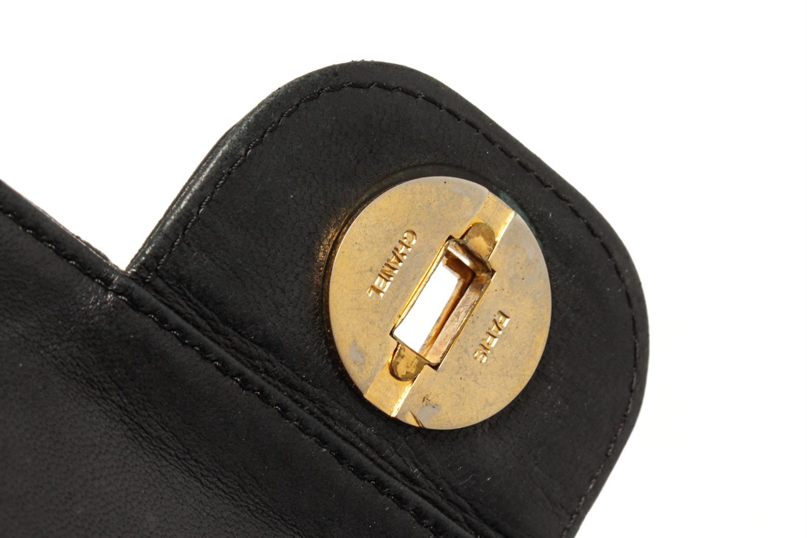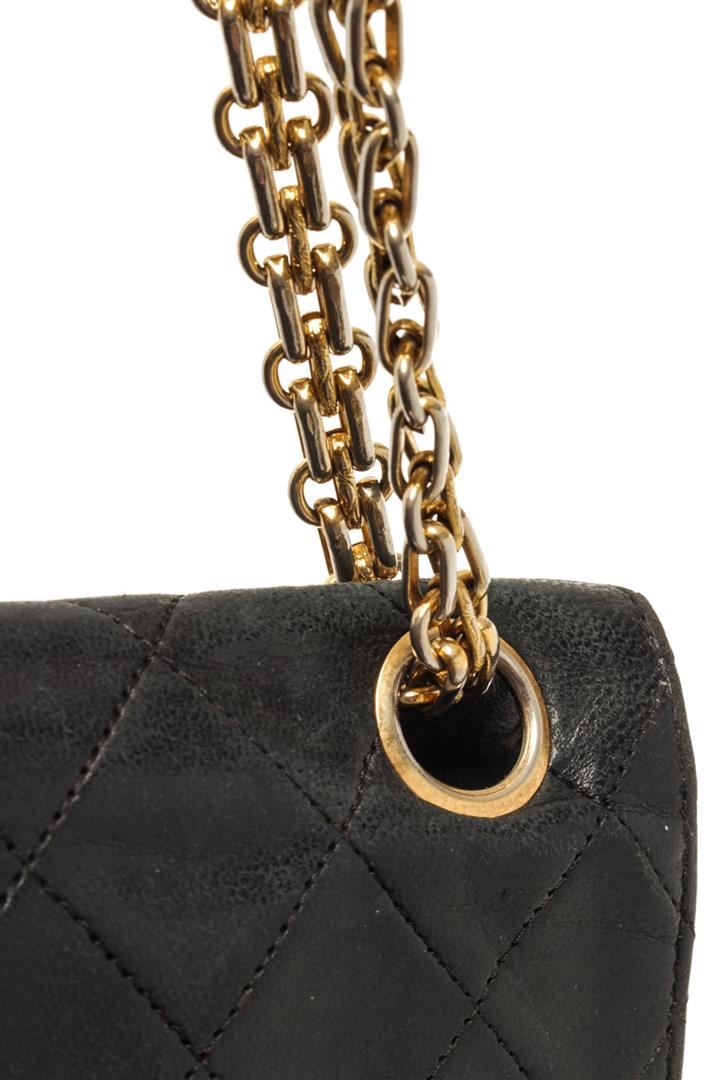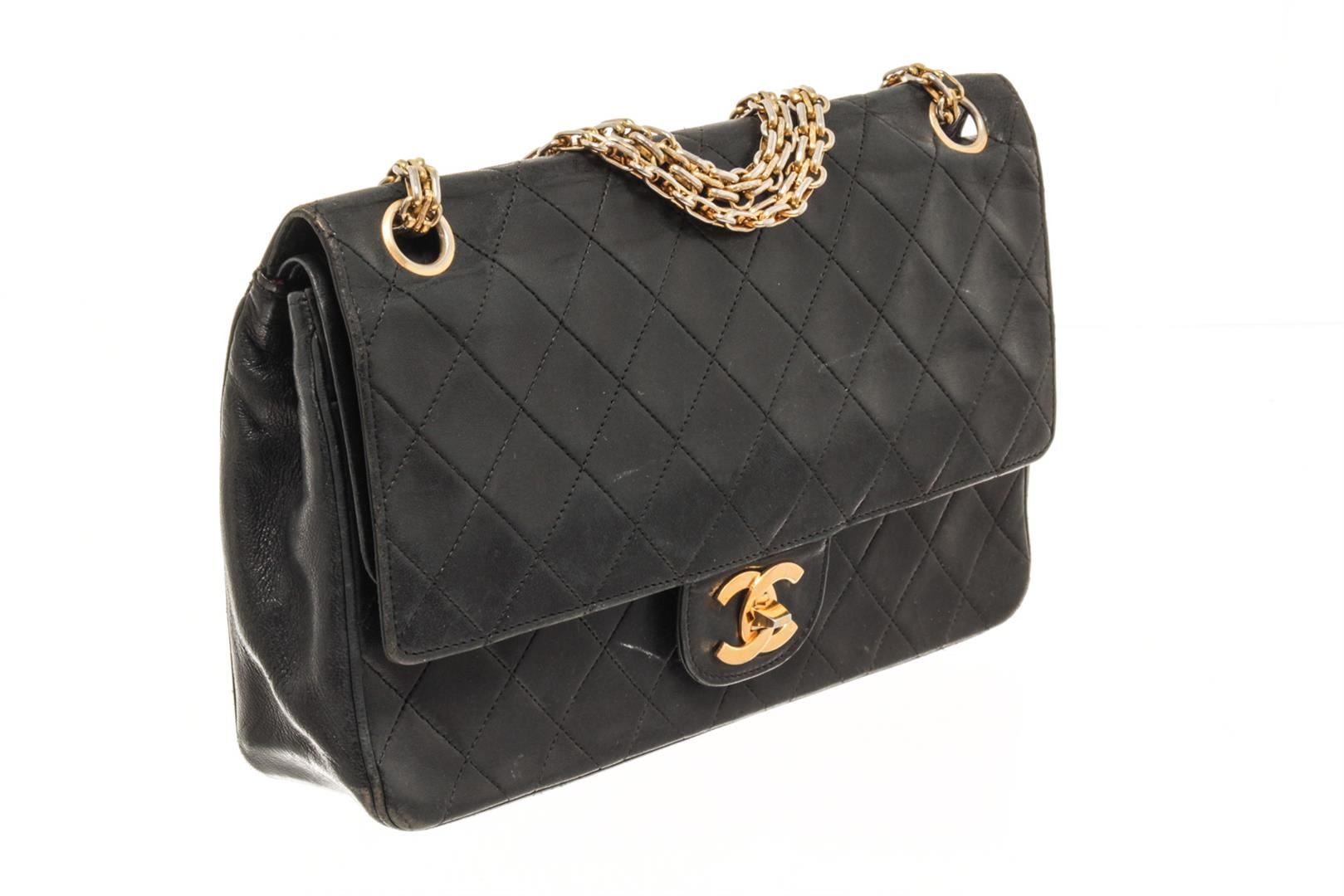 One Chanel Black Leather Chain Double Flap Shoulder Bag. Item is sold AS-IS. All available information is listed in the description and shown in the photo. chanel black leather chain double flap shoulder bag with leather, gold-tone hardware, interior slip pocket, chain shoulder strap and snap closure. Height: 7" Width: 2" Depth: 10", Handle Drop: / 17.78 x 5.08 x 25.4 Cm