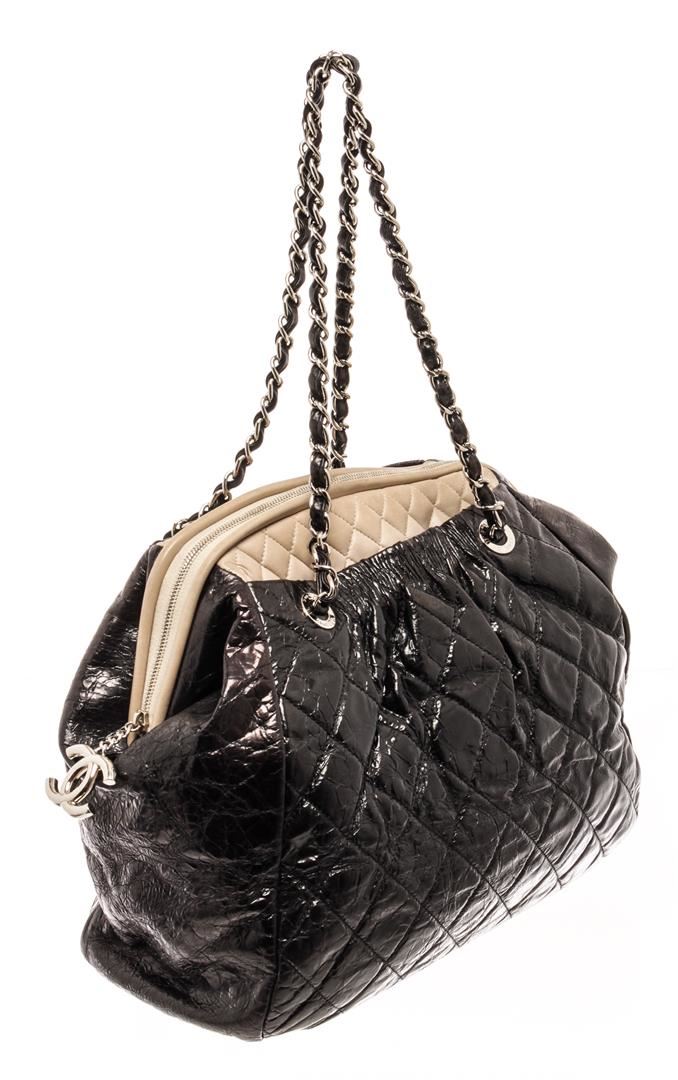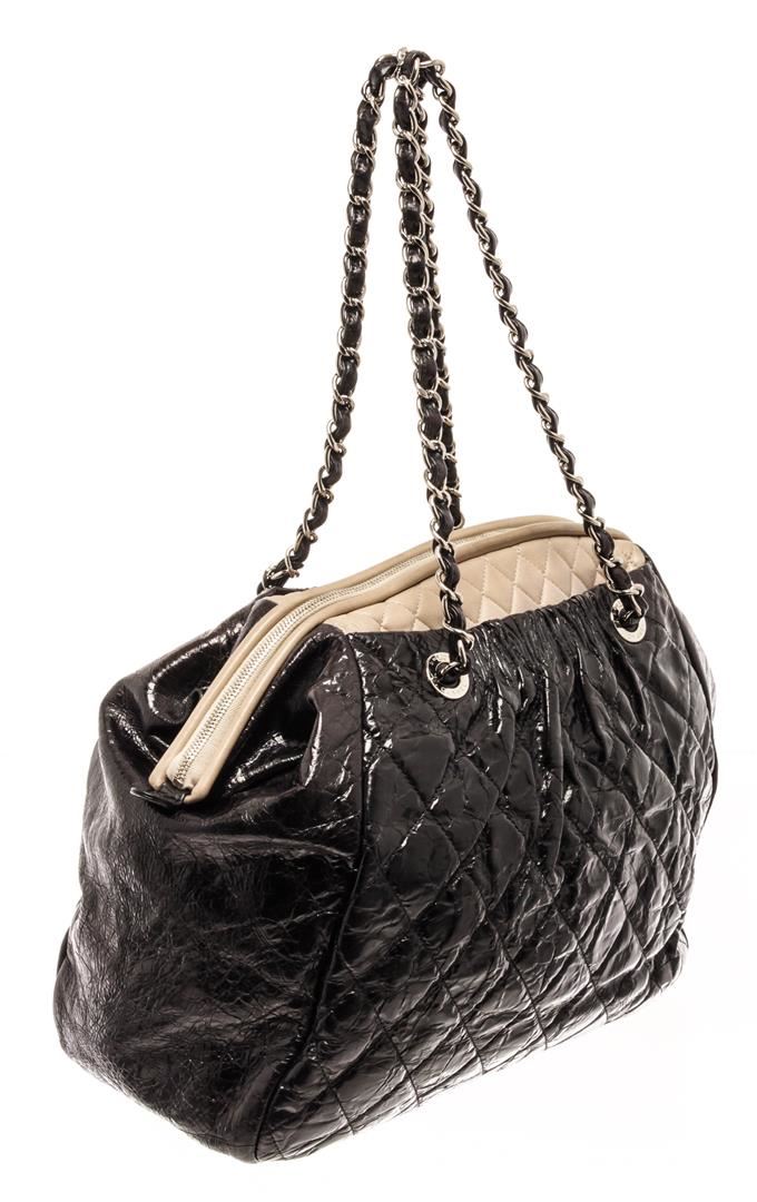 Chanel Black Leather Chain Tote Bag. All available information is listed in the description and shown in the photos. chanel black leather chain tote bag with gold-tone hardware, chain-link shoulder strap, full lining, top zip fastening. Height: 20.32 cm (8 in), Width: 19.05 cm (7.5 in), Depth: 3.81 cm (1.5 in)