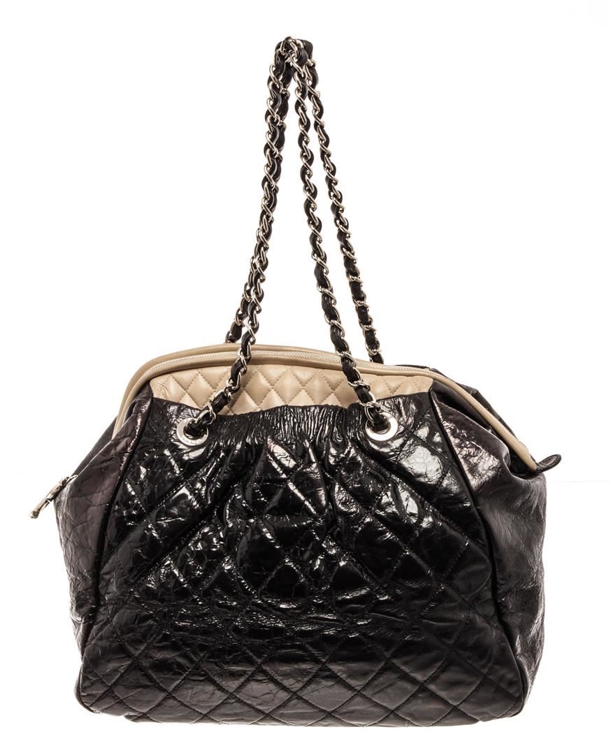 Chanel Black Leather Chain Tote Bag. All available information is listed in the description and shown in the photos. chanel black leather chain tote bag with gold-tone hardware, chain-link shoulder strap, full lining, top zip fastening. Height: 20.32 cm (8 in), Width: 19.05 cm (7.5 in), Depth: 3.81 cm (1.5 in)