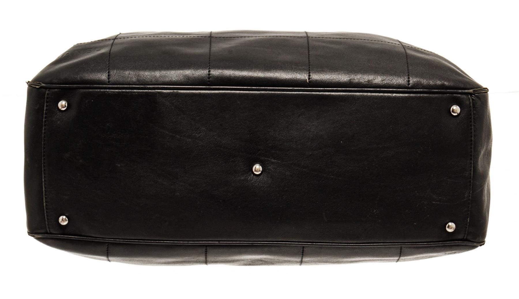 One Chanel Black Leather Chocolate Bar Handbag. Item is sold AS-IS. All available information is listed in the description and shown in the photo. Chanel black leather Chocolate Bar handbag with black leather exterior, straight stitching, dark brown "CHANEL" patterned fabric lining, silver-tone hardware, zipper closure, and two top handles. Conditions: moderate loss of shape, wear, scuffs, and marks on exterior and handles, heavy wear on base and opening corners, loose stitches on rear handle base. moderate wear in the interior, scratches, discoloration, and tarnish on hardware.