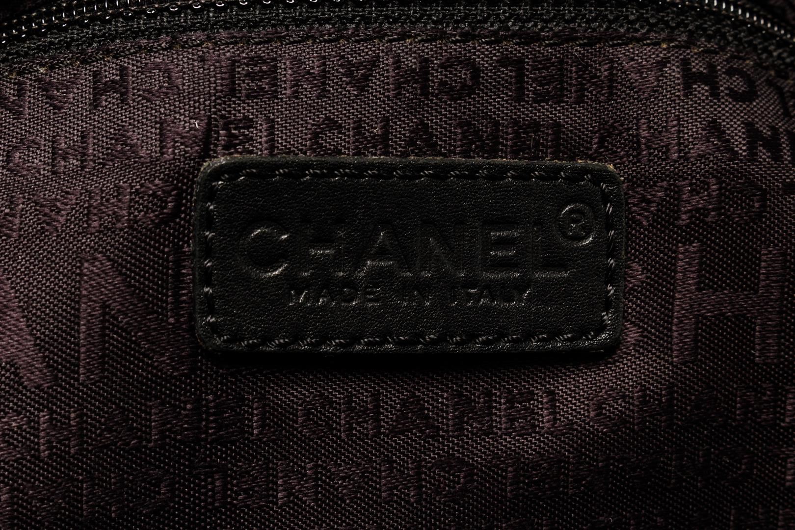 One Chanel Black Leather Chocolate Bar Handbag. Item is sold AS-IS. All available information is listed in the description and shown in the photo. Chanel black leather Chocolate Bar handbag with black leather exterior, straight stitching, dark brown "CHANEL" patterned fabric lining, silver-tone hardware, zipper closure, and two top handles. Conditions: moderate loss of shape, wear, scuffs, and marks on exterior and handles, heavy wear on base and opening corners, loose stitches on rear handle base. moderate wear in the interior, scratches, discoloration, and tarnish on hardware.