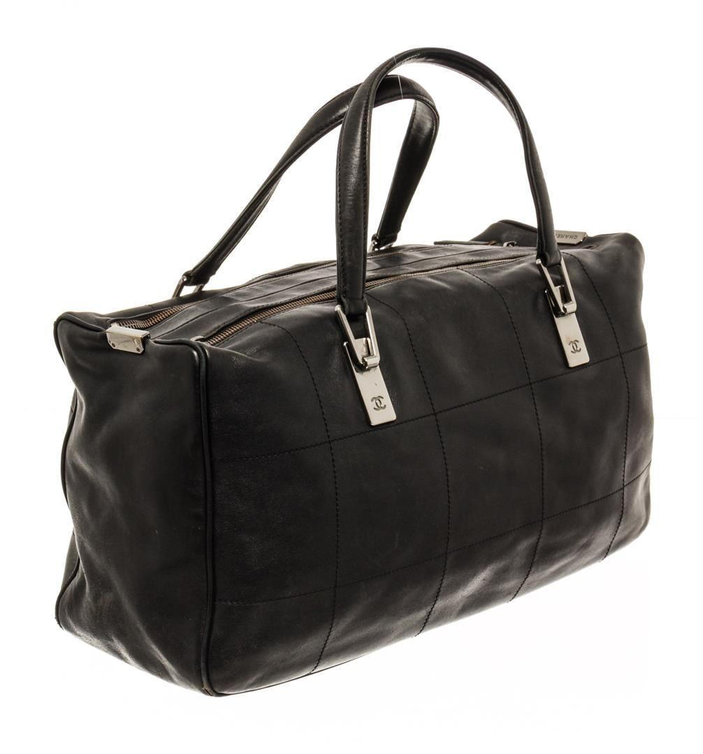 One Chanel Black Leather Chocolate Bar Handbag. Item is sold AS-IS. All available information is listed in the description and shown in the photo. Chanel black leather Chocolate Bar handbag with black leather exterior, straight stitching, dark brown "CHANEL" patterned fabric lining, silver-tone hardware, zipper closure, and two top handles. Conditions: moderate loss of shape, wear, scuffs, and marks on exterior and handles, heavy wear on base and opening corners, loose stitches on rear handle base. moderate wear in the interior, scratches, discoloration, and tarnish on hardware.