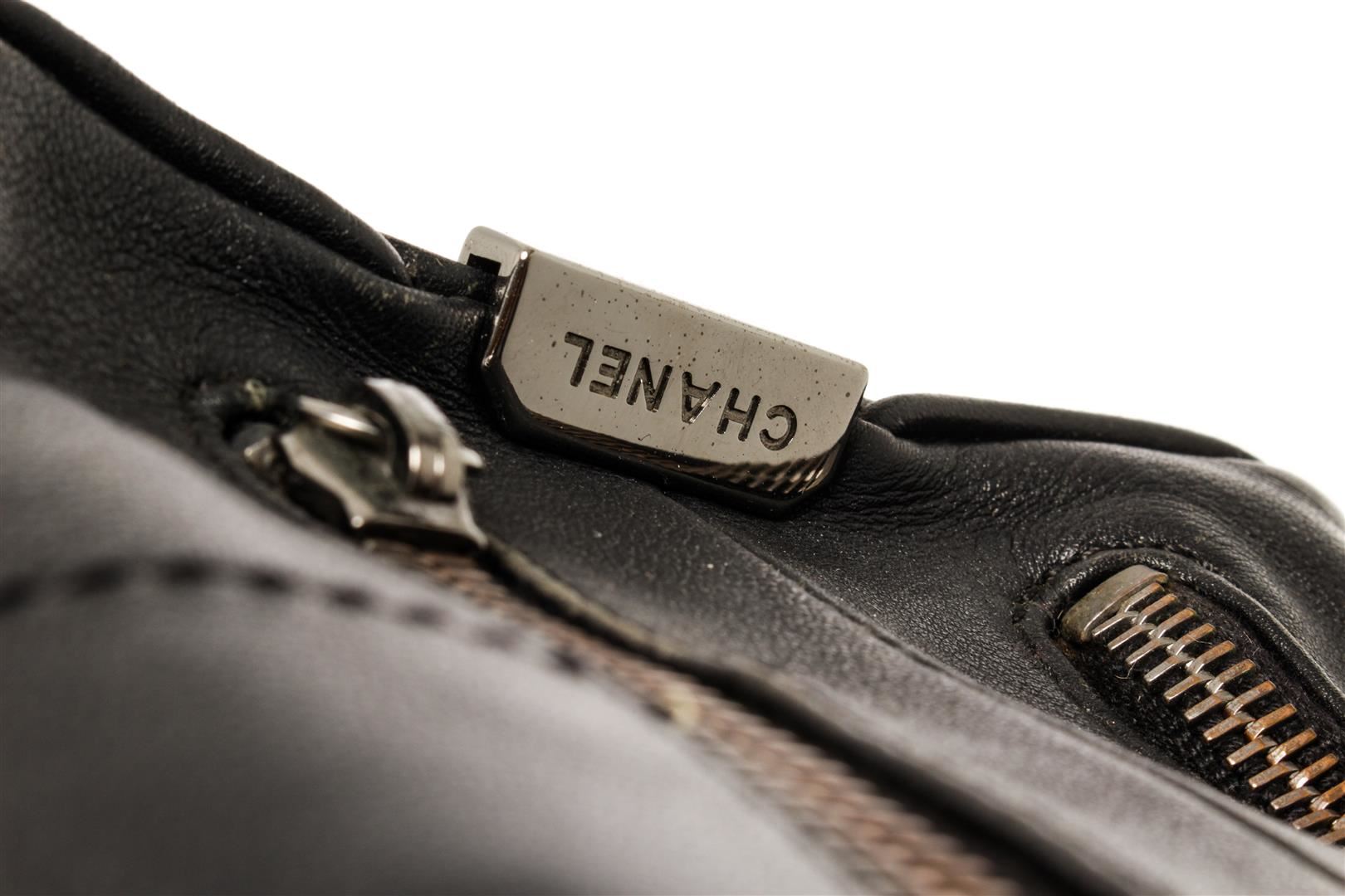 One Chanel Black Leather Chocolate Bar Handbag. Item is sold AS-IS. All available information is listed in the description and shown in the photo. Chanel black leather Chocolate Bar handbag with black leather exterior, straight stitching, dark brown "CHANEL" patterned fabric lining, silver-tone hardware, zipper closure, and two top handles. Conditions: moderate loss of shape, wear, scuffs, and marks on exterior and handles, heavy wear on base and opening corners, loose stitches on rear handle base. moderate wear in the interior, scratches, discoloration, and tarnish on hardware.