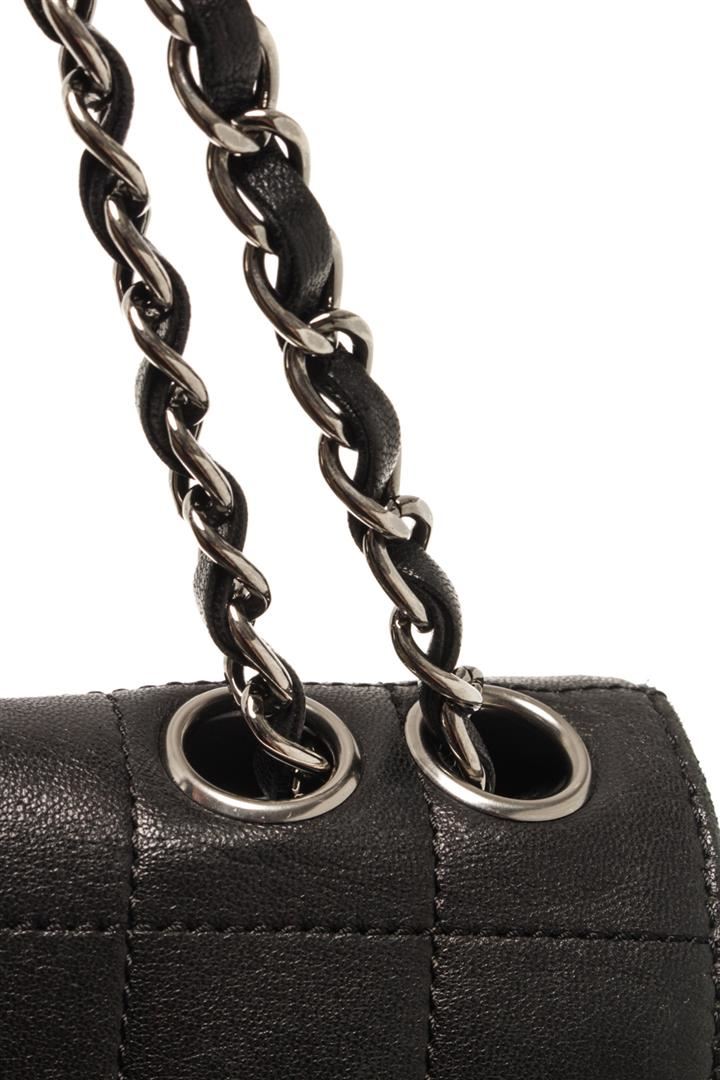 One Chanel Black Leather Chocolate Bar Shoulder bag. Item is sold AS-IS. All available information is listed in the description and shown in the photo. Chanel Black Leather Chocolate Bar Shoulder bag with material leather, silver-tone hardware, chain/leather shoulder strap, interior pocket, fabric interior, snap closure. H4.5 X W8 X D1.5 inches Strap drop(Single) : 13 inches Strap drop(double) : 7 inches H11 X W20 X D4 cm