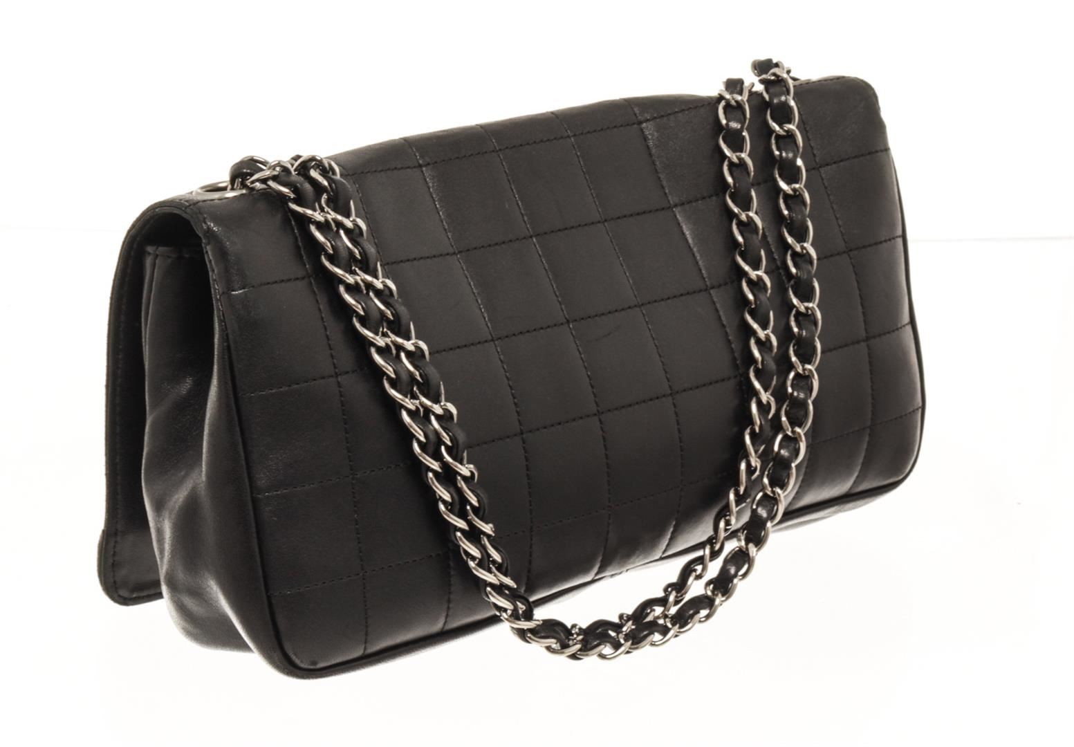One Chanel Black Leather Chocolate Bar Shoulder bag. Item is sold AS-IS. All available information is listed in the description and shown in the photo. Chanel Black Leather Chocolate Bar Shoulder bag with material leather, silver-tone hardware, chain/leather shoulder strap, interior pocket, fabric interior, snap closure. H4.5 X W8 X D1.5 inches Strap drop(Single) : 13 inches Strap drop(double) : 7 inches H11 X W20 X D4 cm