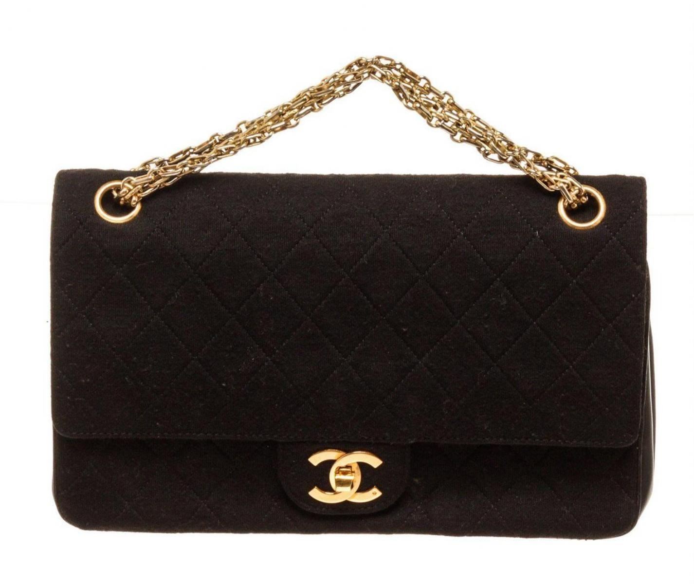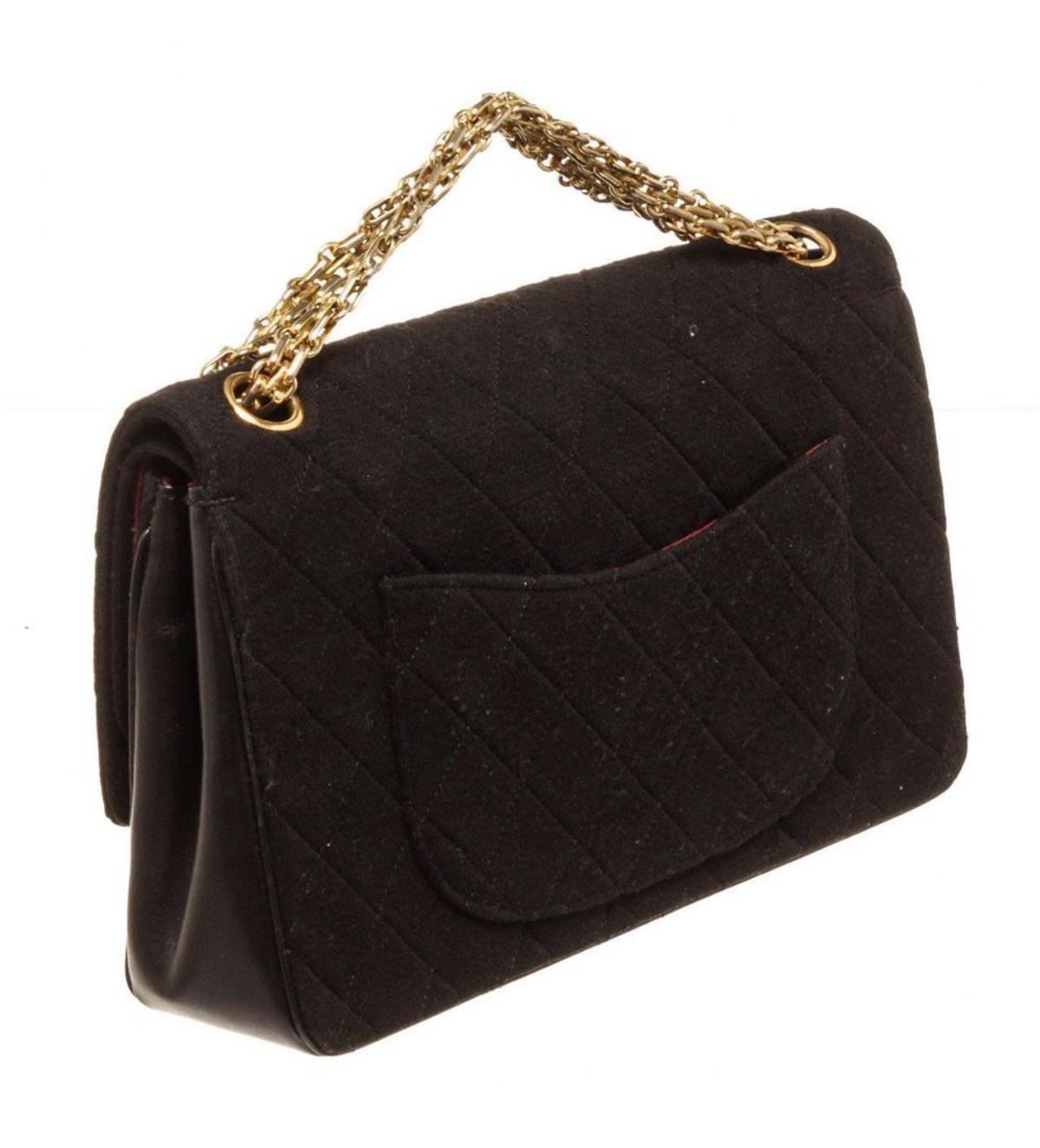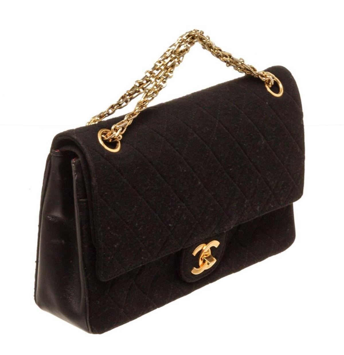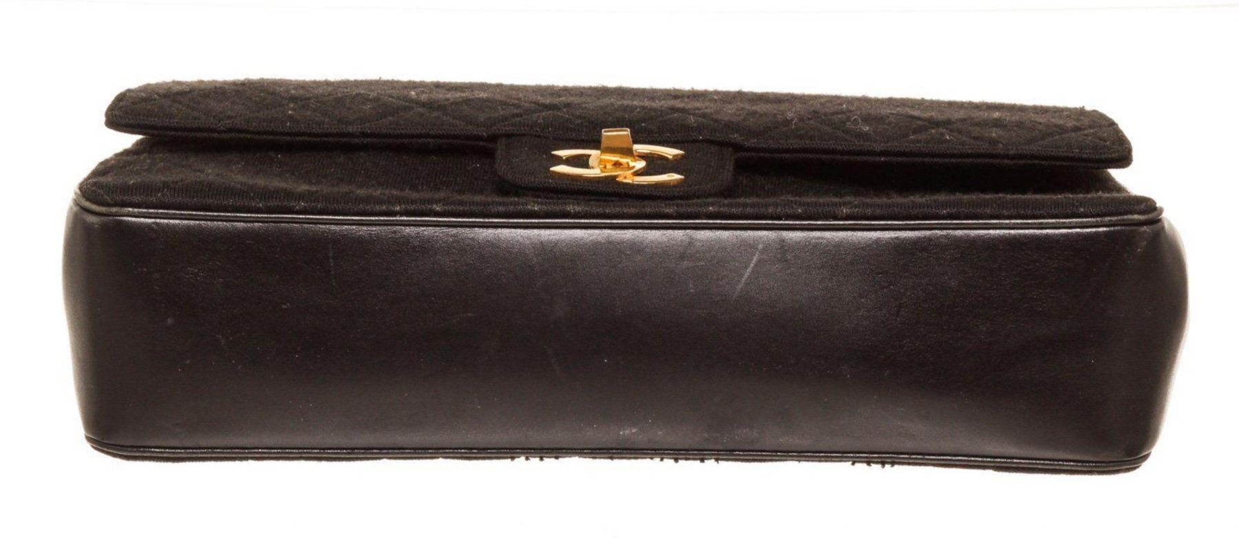 Chanel Black Leather Classic Double Flap Bag with Material Leather, gold-tone hardware, Exterior & interior slip pocket, Leather shoulder strap and CC turn-lock closure at front flap.