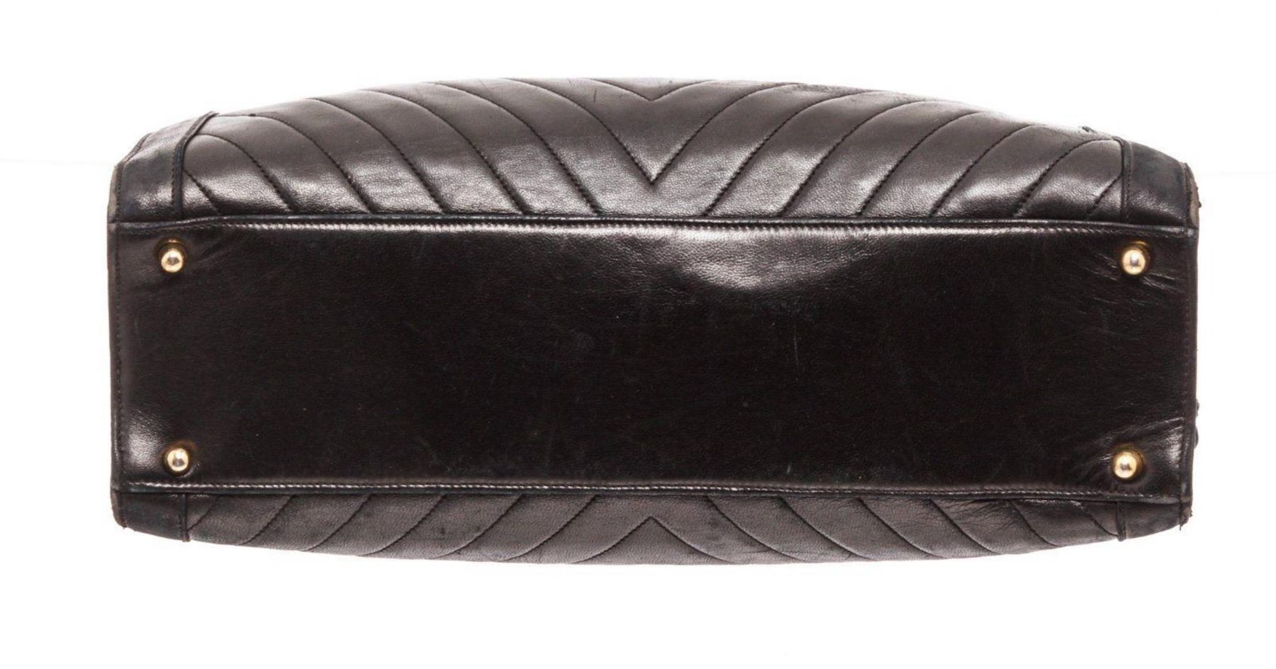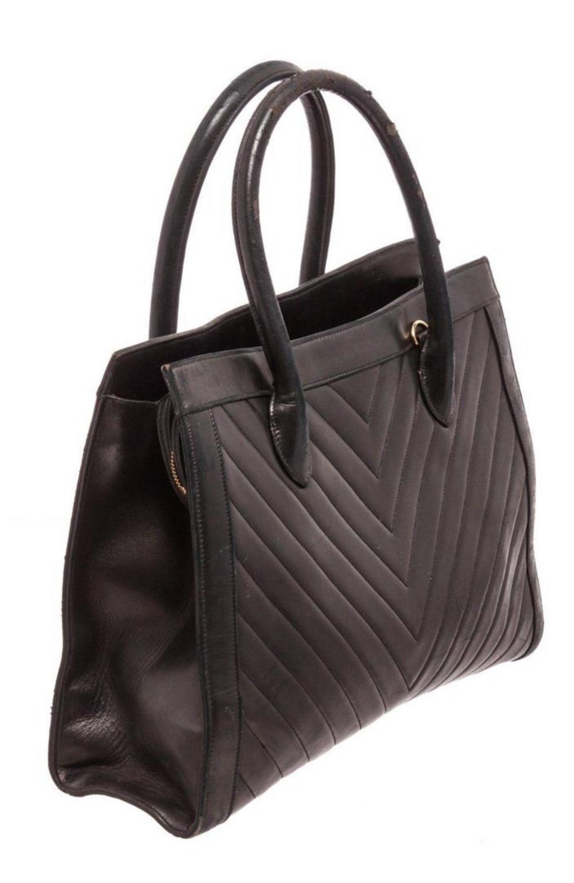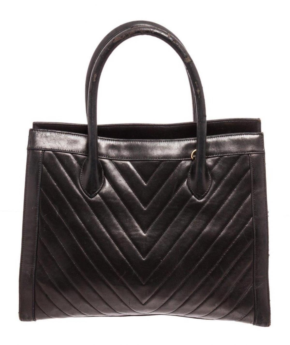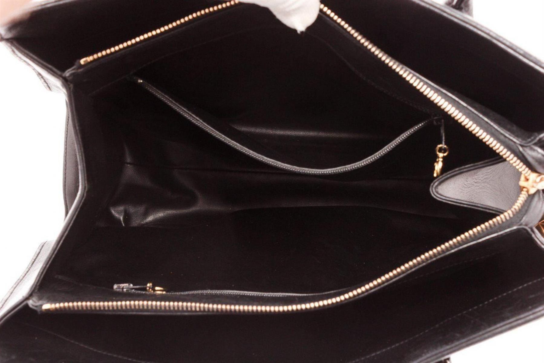 Chanel Black Leather Double Handle Tote Bag with silver-tone hardware, leather trim, interior flap pockets, leather shoulder strap, and flap closure. Measurements: Length: 6.25 in / 16 cm Width: 14 in / 36 cm 10 in / 25 cm Condition: Pre-Owned Good overall, please see photographs for detail.
