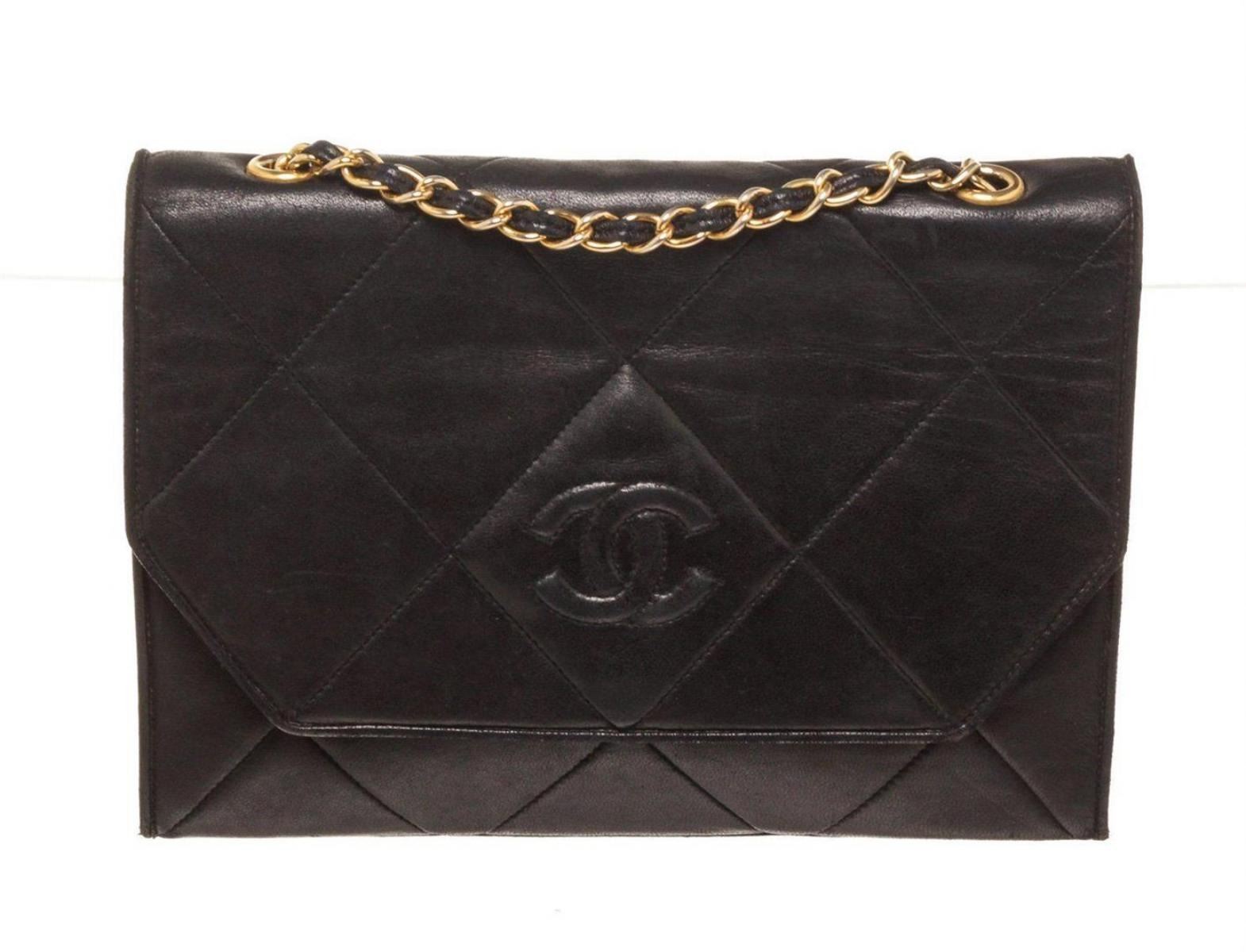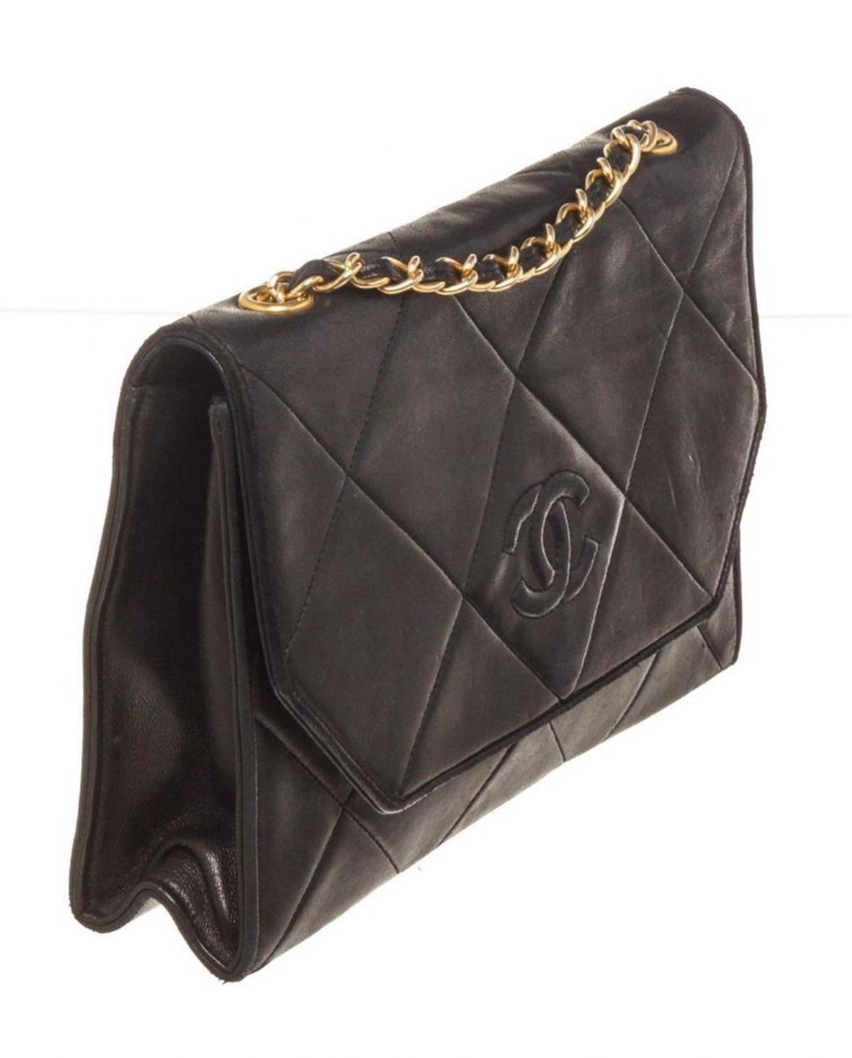 Chanel Black Leather Envelope Flap Shoulder Bag with Interlocking CC Logo, Gold-Tone Hardware, Chain-Link Shoulder Strap, Leather Lining & Single Interior Pocket, Turn-Lock Closure.