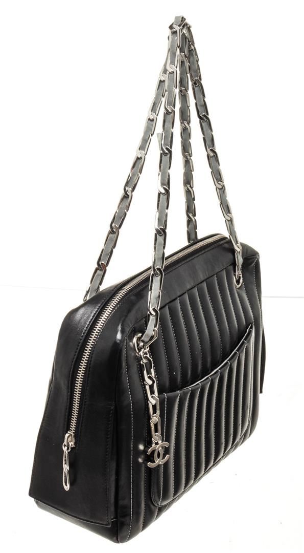 One Chanel Black Leather Mademoiselle Shoulder Bag. Item is sold AS-IS. All available information is listed in the description and shown in the photo. Chanel Black Leather Mademoiselle Shoulder Bag with leather, silver-tone hardware, trim leather, interior zip slip pocket, chain shoulder strap and zipper closure.