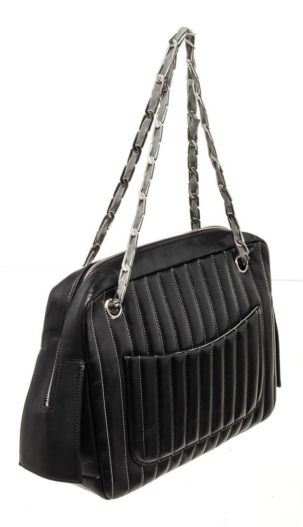 One Chanel Black Leather Mademoiselle Shoulder Bag. Item is sold AS-IS. All available information is listed in the description and shown in the photo. Chanel Black Leather Mademoiselle Shoulder Bag with leather, silver-tone hardware, trim leather, interior zip slip pocket, chain shoulder strap and zipper closure.